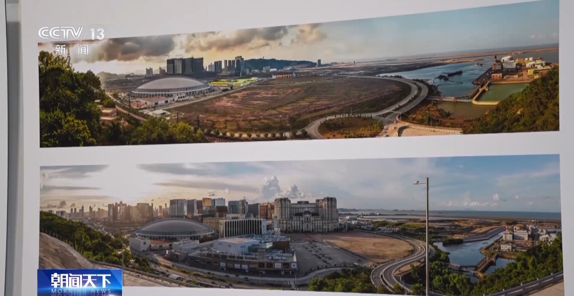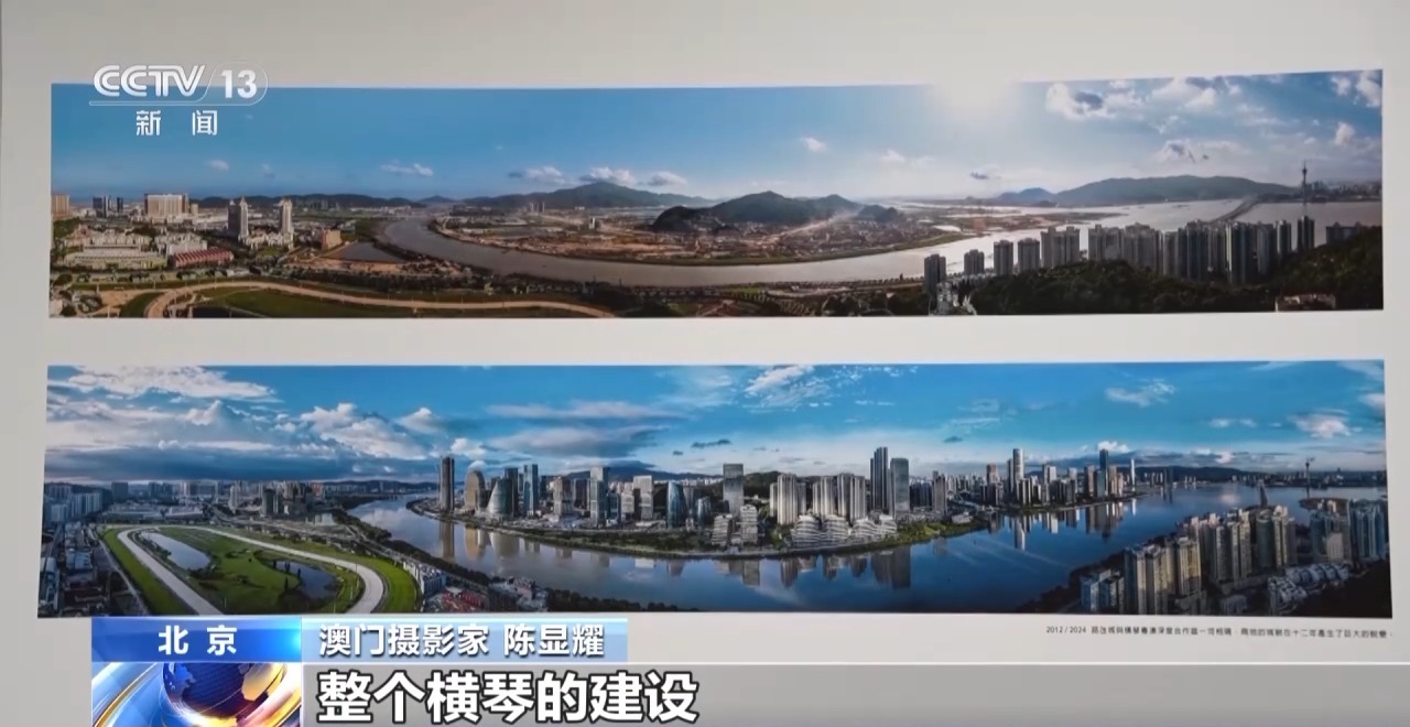 澳门摄影家 陈显耀:回归之后,随着我们澳门的发展,也是带动周边区域一起发展繁荣。我们画面看到的是横琴,上面的照片是2012年的时候,横琴都是山体,在准备开发了。下面是成立的横琴粤澳深度合作区,整个横琴的建设也为我们澳门的发展建设提供了一个很重要的支撑、保障。