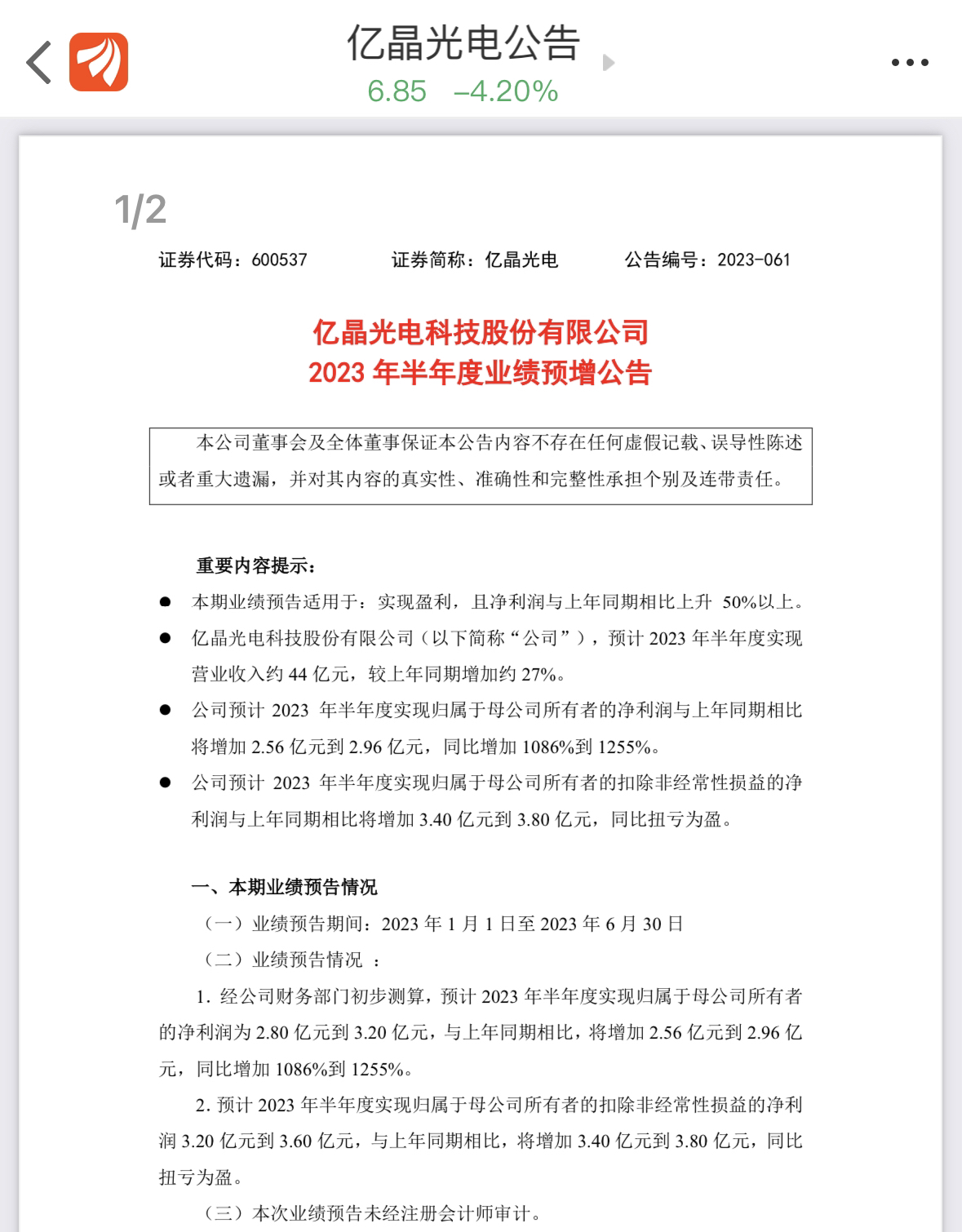 不仅是钧达股份,多家光伏产业链上市公司受益于上游原材料价格下跌,成本下降,叠加需求向好,上半年业绩普遍预喜。目前已披露业绩预告的A股光伏组件公司中,亿晶光电的净利润预计增幅最大,公司预计上半年净利润2.8亿元至3.2亿元,同比增加1086%至1255%。上半年净利增幅高达10倍以上。