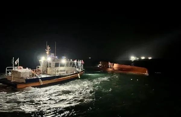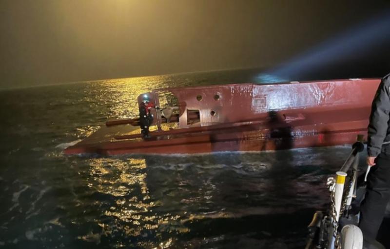 一艘渔船在全罗南道新安郡附近海域倾覆。图源:韩媒