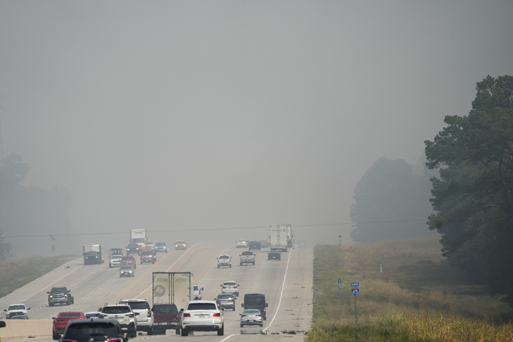 △当地时间9月2日,受山火影响,得克萨斯州亨茨维尔市烟雾弥漫,能见度低