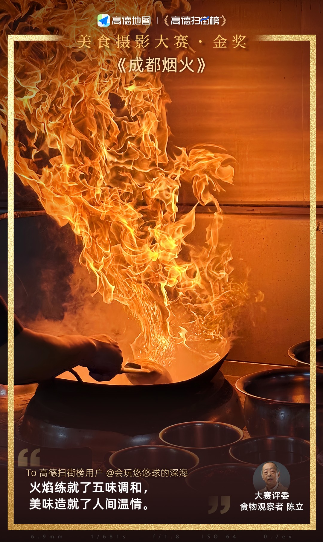9月28日,高德扫街榜美食摄影大赛落幕,来自四川成都的小伙拍摄的《成都烟火》夺得金奖,获得5万元“高德扫街榜上榜餐厅全年免费吃”奖励。此次获奖作品记录的是一瞬间的后厨火焰,生动展现了川菜烹饪的热烈与鲜活。大赛评委陈立对《成都烟火》给予了肯定:“火焰练就了五味调和,美味造就了人间温情。”