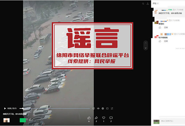 近日,有网民在微信视频号发布帖文称“绵阳天天下雨,停车停高点哦”,并配附一段暴雨中大量车辆被积水淹没的视频,引发部分网民关注和询问。绵阳市委网信办第一时间开展核查核实,明确该网传信息为移花接木的虚假谣言,并非绵阳实际情况。