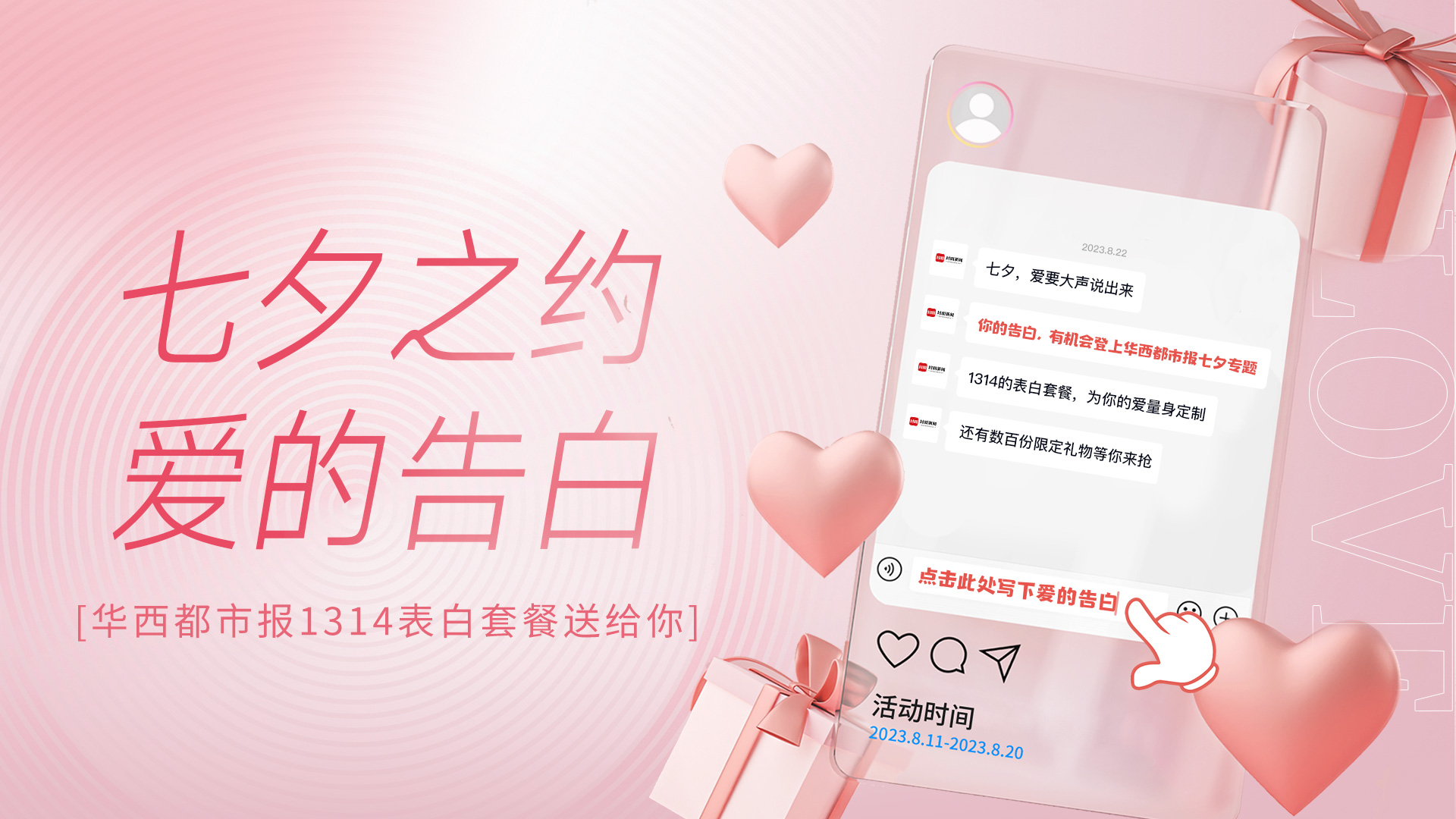 即日起至2023年8月20日,登录封面新闻APP完成注册和实名认证后,在“互动”区内点击“七夕之约 爱的告白——华西都市报1314表白套餐送给你”活动入口,进入活动H5页面,写下自己的告白或爱情故事,还有机会抽取到七夕惊喜礼物。最终经过“动态点赞(50%)+官方评选(50%)”相结合的方式,将评选出前3位获奖者。