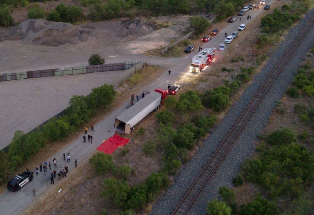 2022年6月27日,工作人员在美国得克萨斯州圣安东尼奥市发现一辆被弃的货车,车内53名移民死亡。这是美国近年来最严重的边境人口走私致死事件,死者来自墨西哥、危地马拉、洪都拉斯和萨尔瓦多。新华社发(尼克·瓦格纳摄)