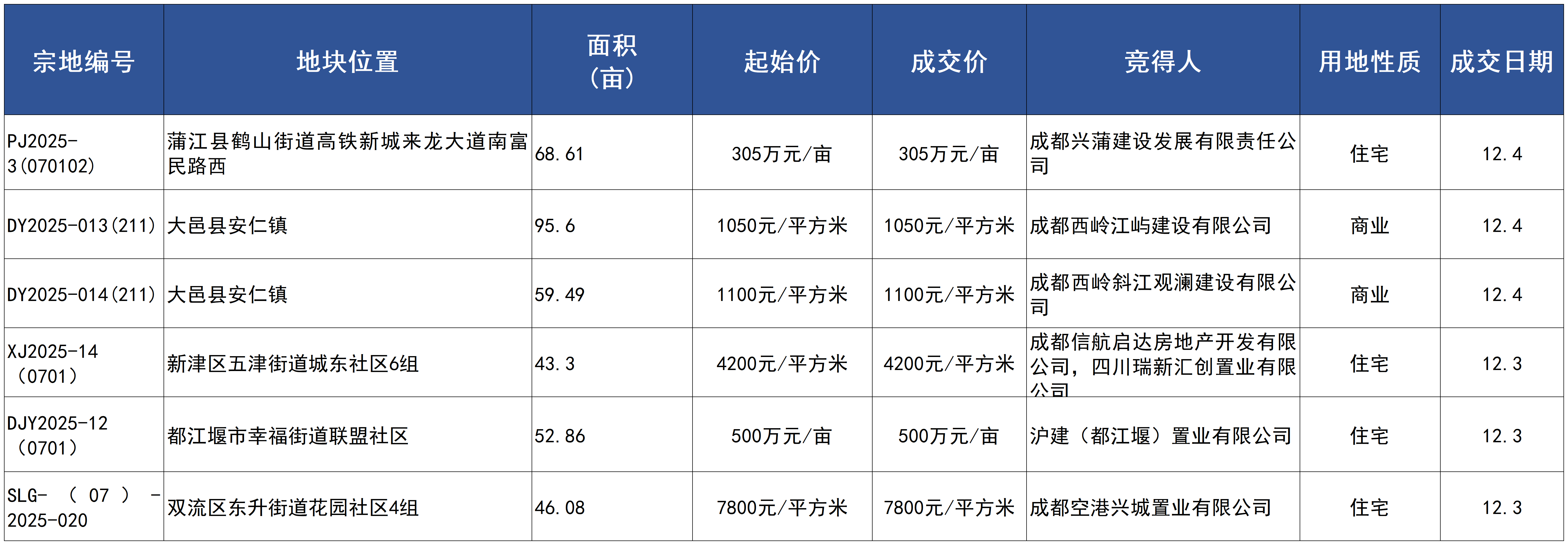据成都市公共资源交易服务中心,本周(11月27日-12月3日)大成都范围内共成交6宗住宅、商业用地,面积合计约365.94亩,均位于成都二、三圈层,均为底价成交。
