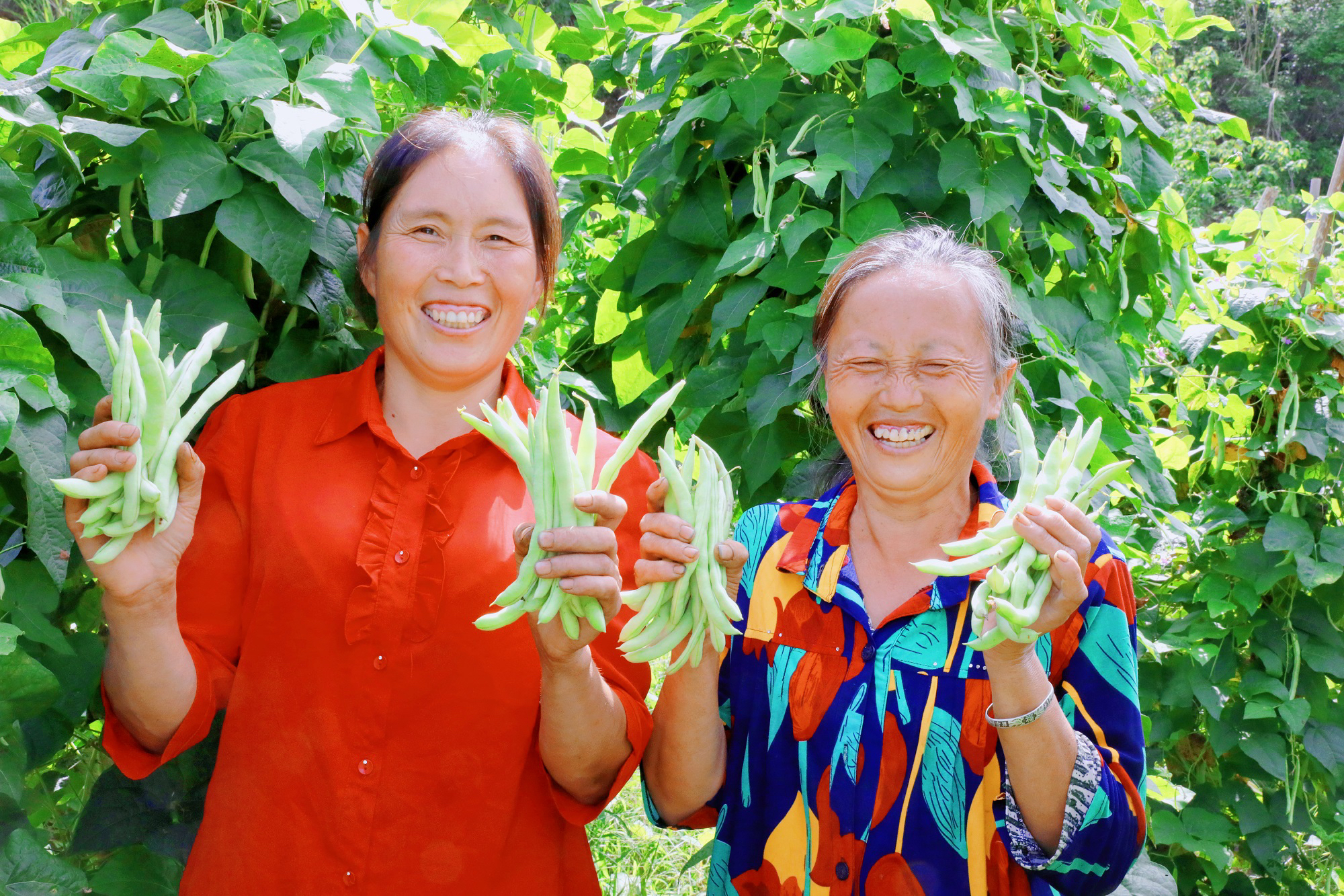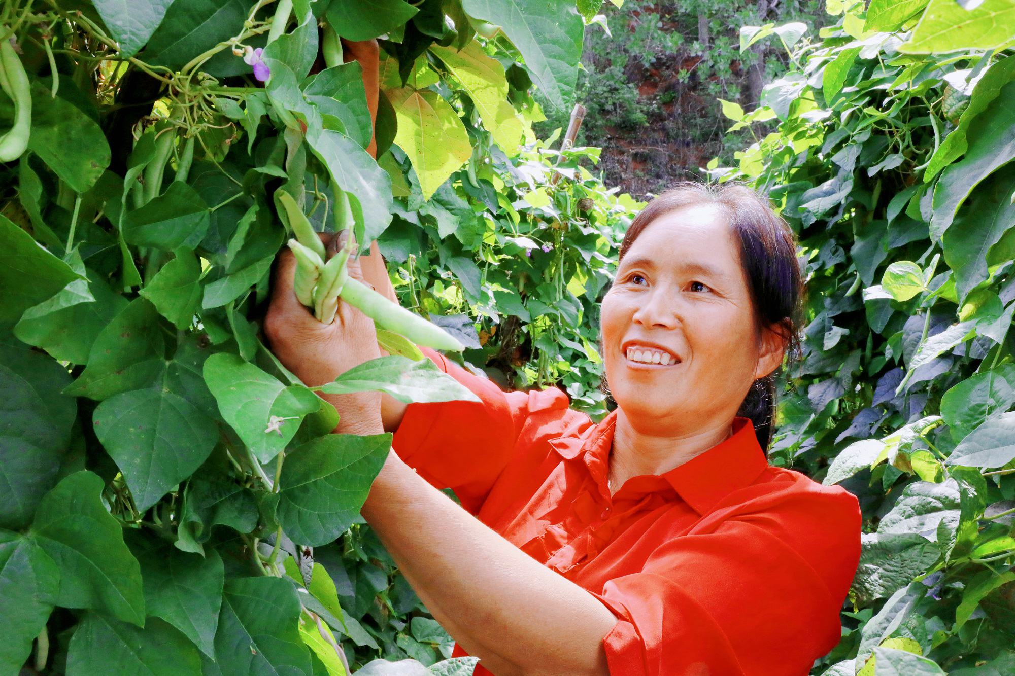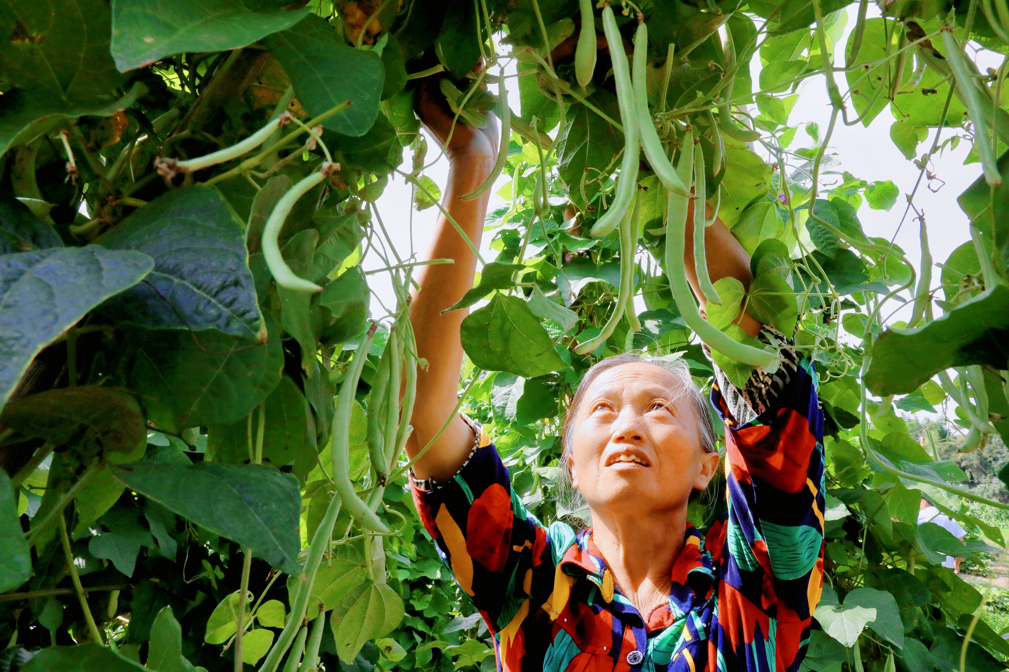 郁郁葱葱的地里,前来务工的村民三三两两分散在各处忙碌采摘着。随着一声脆响,新鲜的四季豆应声摘下,随手放入身旁的筐里,动作娴熟利索,忙而有序,一会儿的工夫整个筐就装满了。