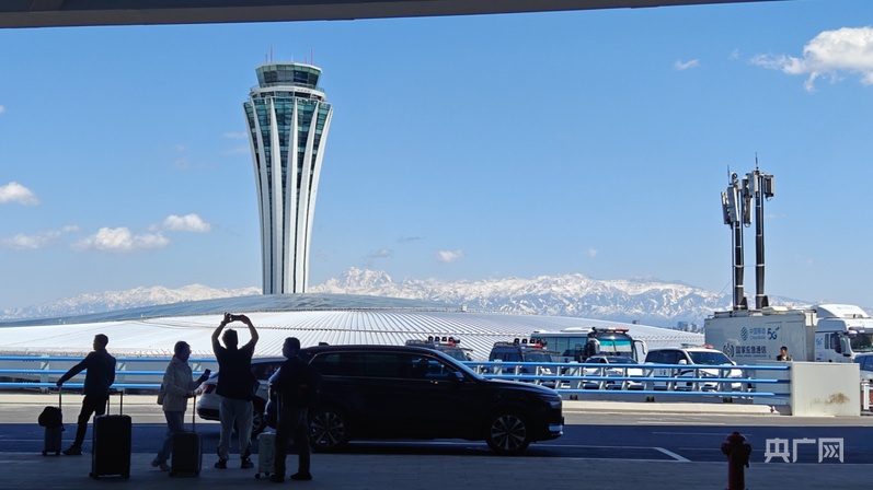 在北航站区新航站楼前拍照留念的旅客 (央广网记者郭璁悦 摄)