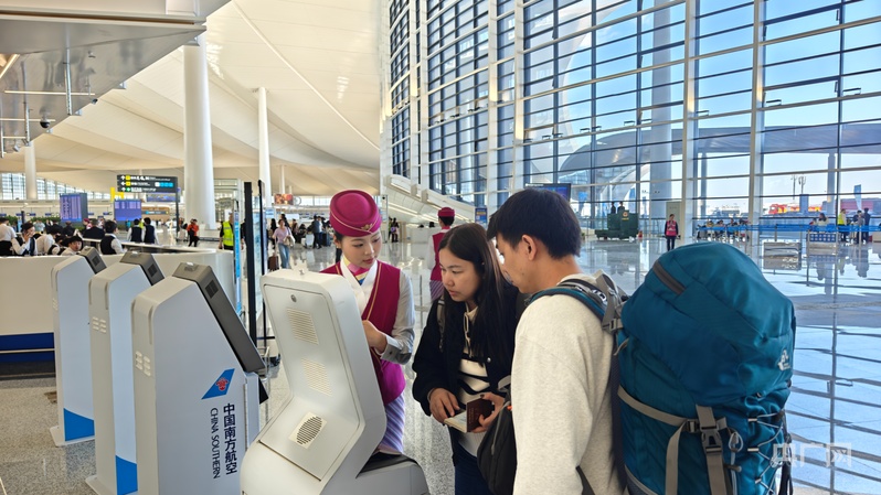 南航工作人员帮助外国游客值机 (央广网记者郭璁悦 摄)