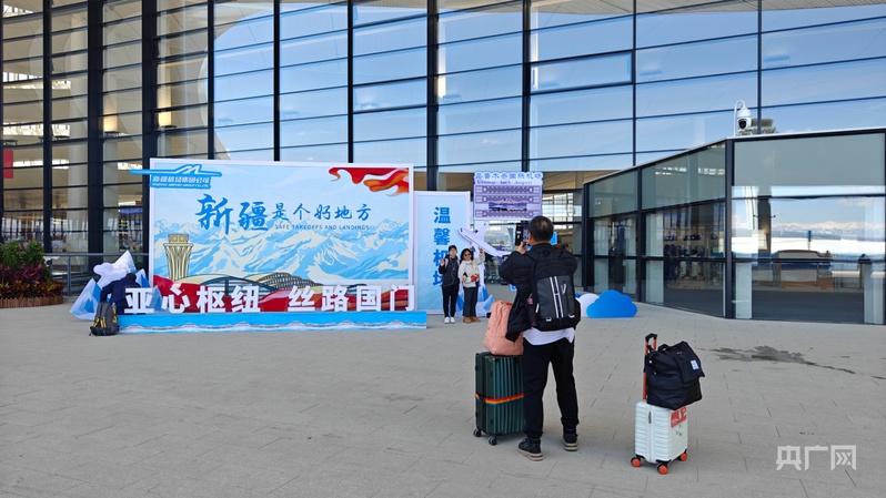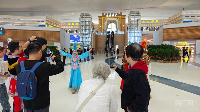 游客在北航站区感受新疆风情 (央广网记者郭璁悦 摄)
