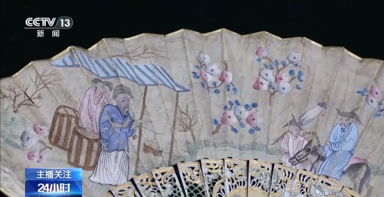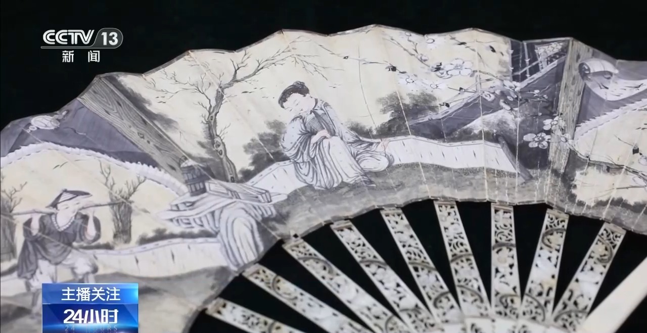 广州邮局海关关员 肖骏华:这两把折扇的扇面绘有古代日常生活场景,整体场景逼真,纹饰华美。扇柄部分呈黄白色,表面有两组圆弧状的交叉线条,呈菱形网格图案,这是象牙特有的“利兹纹”结构。