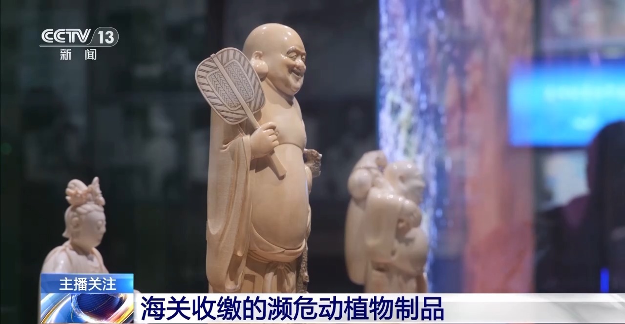 总台央视记者 叶奂:展厅内还有海关缴获的各种象牙制品,非常精美。精雕细琢的“群仙贺寿”牙雕、小巧玲珑的持莲童子挂坠、象牙雕刻的盆景、具有彩绘图案的象牙笔筒。这些精美物品的背后,是无数野生大象在偷猎者屠刀下的血泪故事。