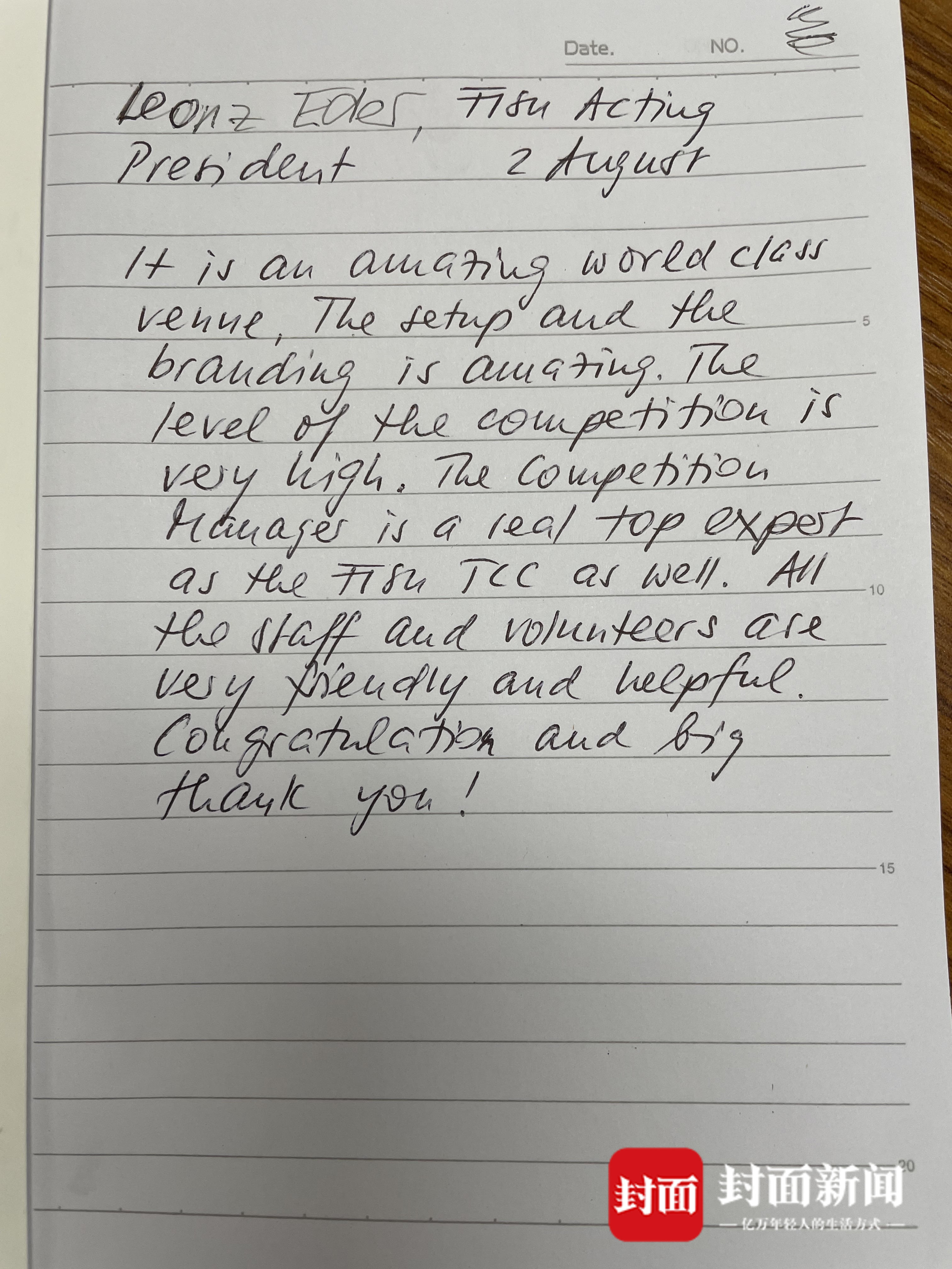 雷诺·艾德主席在饶有兴致地观看了一场乒乓球比赛后,情不自禁地为场馆、赛事以及工作人员点赞。他在留言簿上饱含深情地写道:“这是一座非常漂亮的世界级场馆,设施和品牌宣传都很棒。赛事水平也很高,赛事经理是一位顶级专家,和乒乓球技术委员会主席一样专业。所有的工作人员和志愿者都非常友好,提供了很好的服务。祝贺你们!非常感谢你们!”