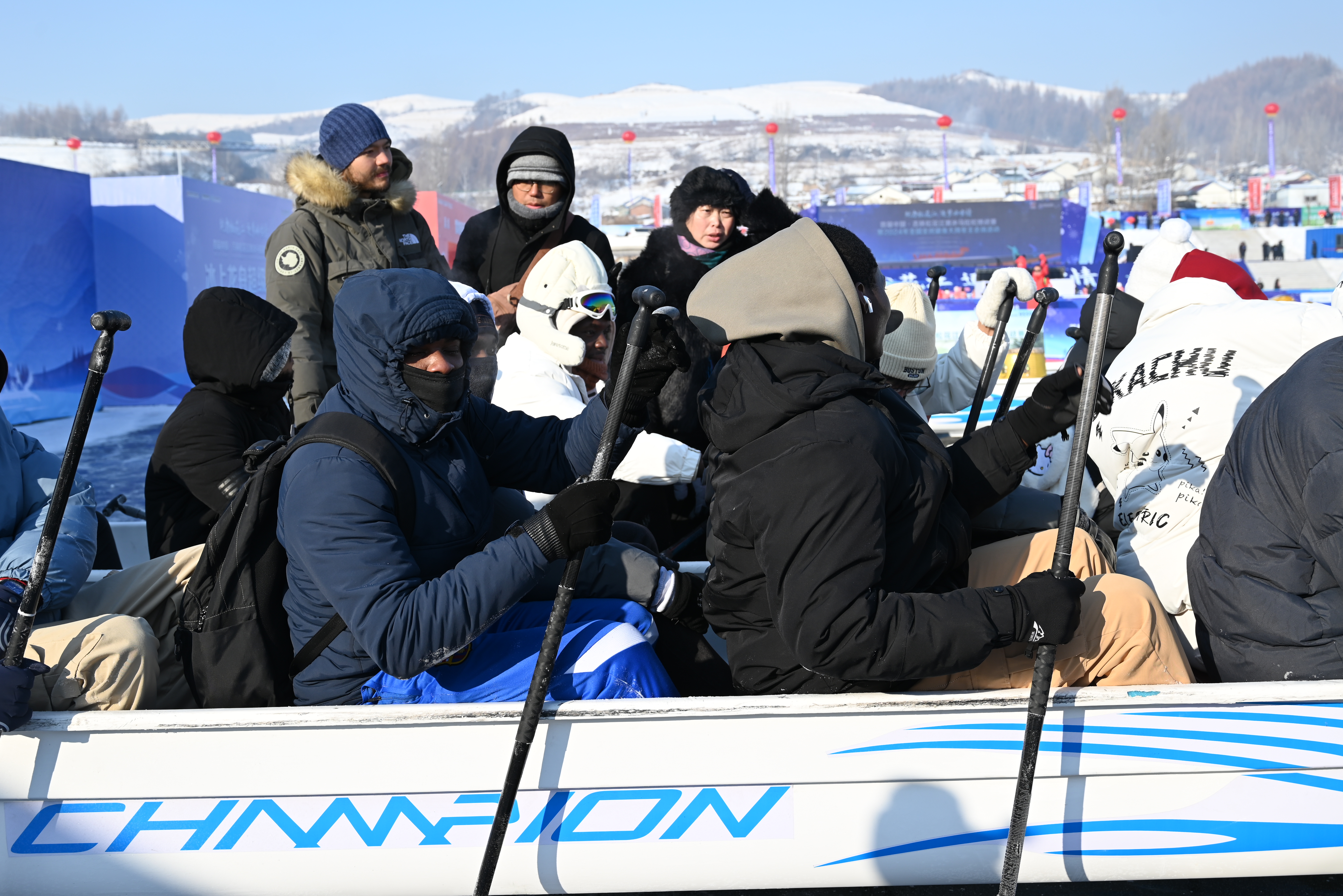 记者在现场看到,30余名外国参赛选手早早来到比赛场地,刚下车的他们,似乎对眼前的一切既感到兴奋又充满期待。“尽管我来中国六年多了,但这是我第一次参加冰雪运动,我特别兴奋,我今天特意穿了两层袜子,但还是很冷。”来自尼日利亚的留学生王佳乐说。这些参赛队员大多是来自赤道附近热带国家的留学生,绝大多数更是第一次接触冰上龙舟,对于冰雪运动的了解屈指可数,他们对冰天雪地充满着无限的期待和好奇。