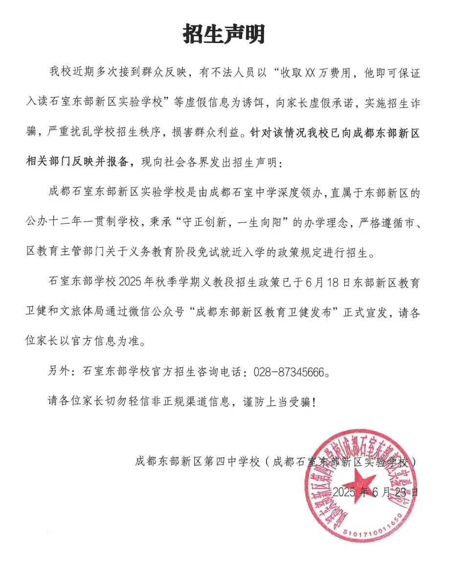 详情:6月23日,成都东部新区第四中学校(成都石室东部新区实验学校)通过微信公众号“石室东部学校”发布招生声明,全文如下: