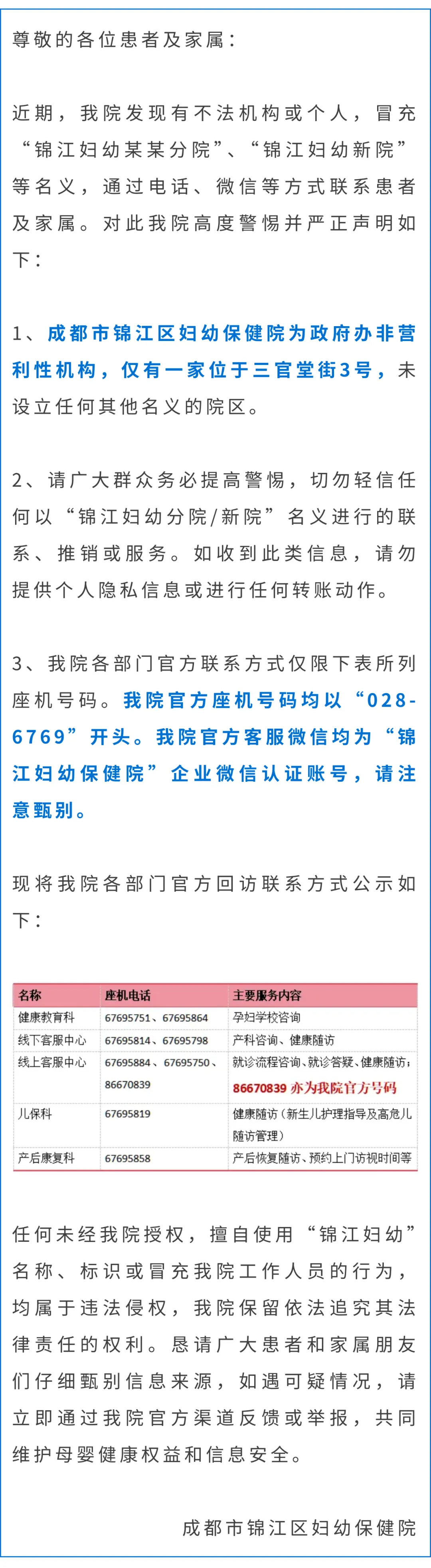 成都市锦江区妇幼保健院严正声明:仅三官堂街一家,勿信分院骗局