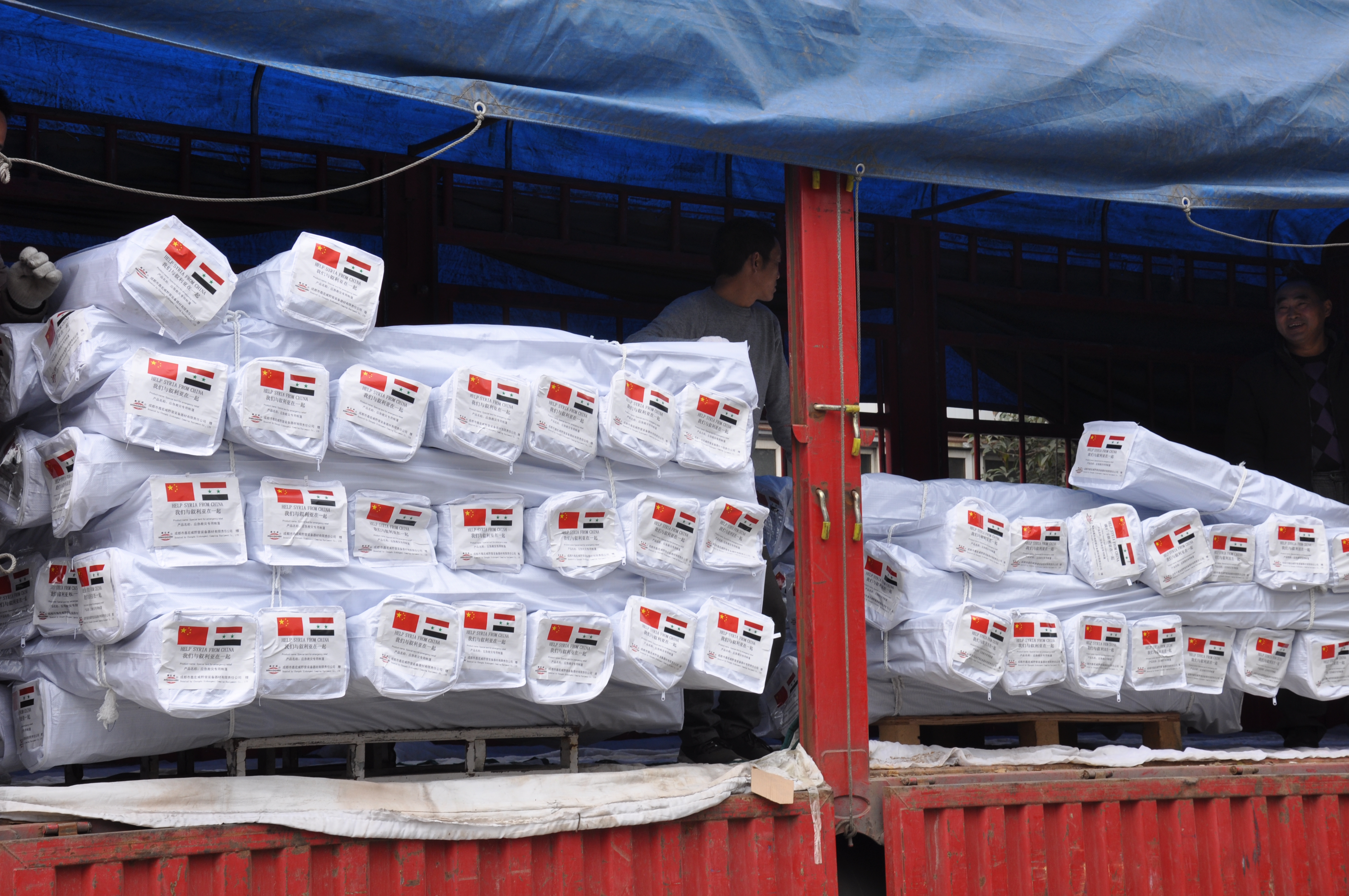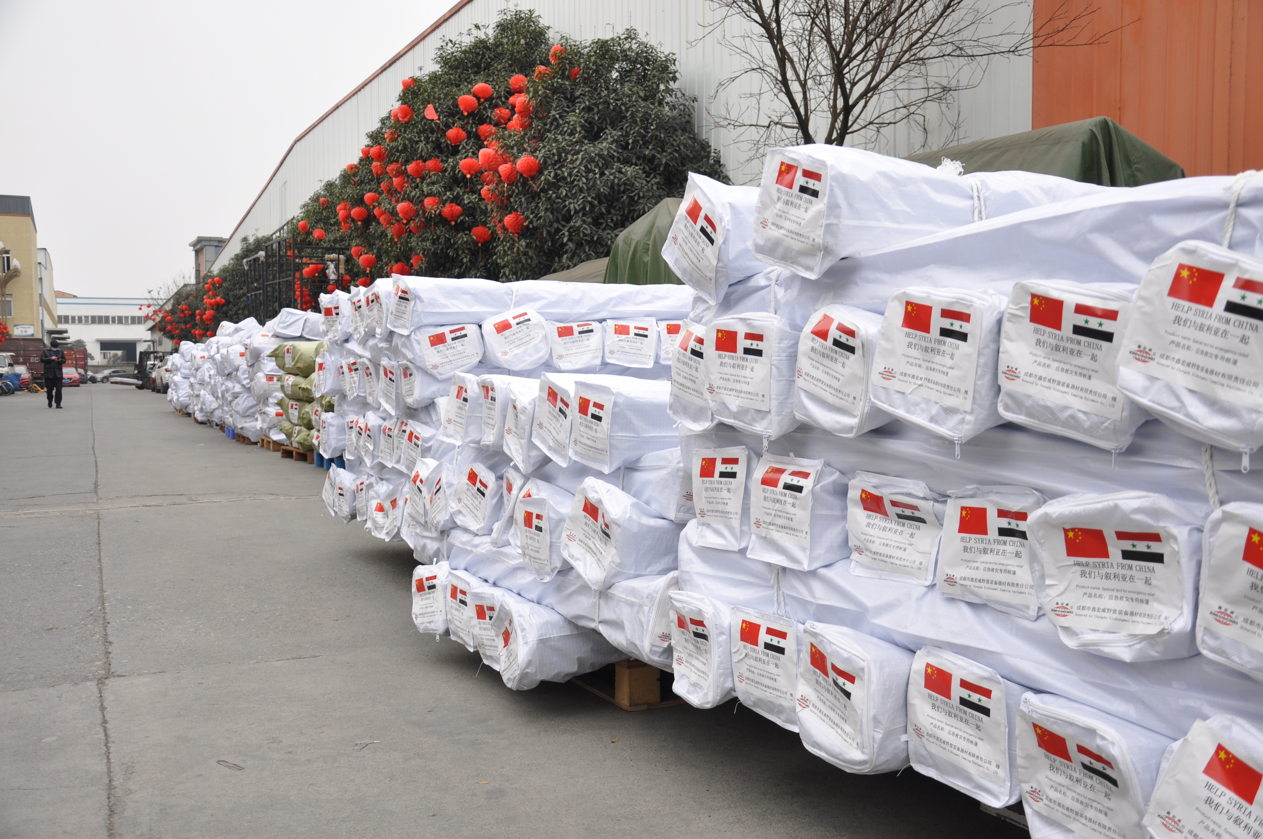 当日下午2时许,这批印着中国国旗和“我们与叙利亚在一起”字样的救援物资已经全部装上了货车。两位司机绕车一圈检查后,坐上驾驶位和副驾驶位,关上车门迅速将汽车发动,驶向工厂大门外。