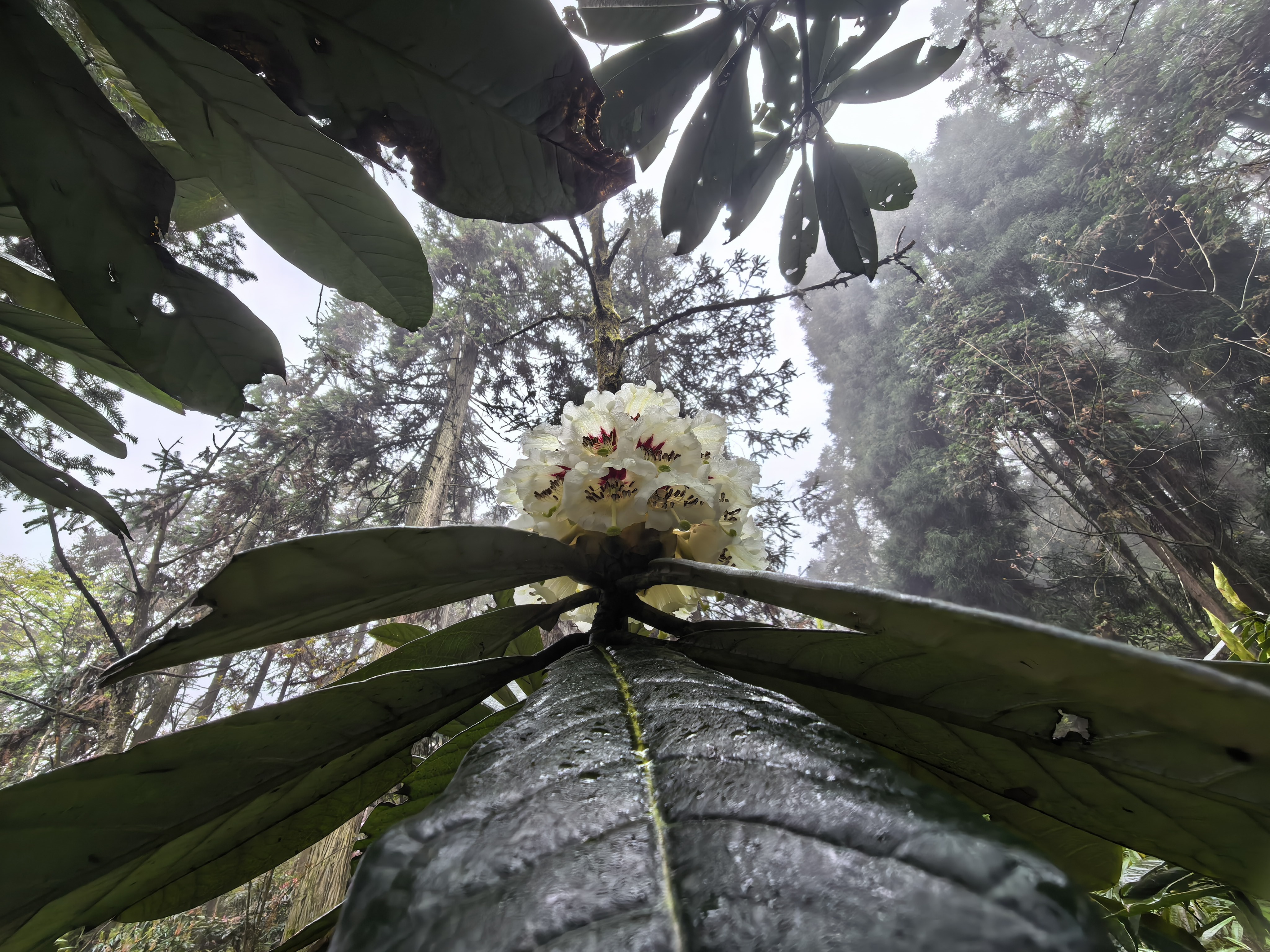 众多杜鹃花木中,它的叶片又大又长,墨绿色,叶子的脉络纹理清晰,跟着树干上的“树”疙瘩,层层递进。那两朵花自然格外突出,它们在枝条的顶端,浅黄色的灯笼形花朵簇拥在一起,花冠基部有一抹艳丽的紫红,花瓣散开,整朵花序呈伞形状,虽立于枝头,却在大叶片中藏藏躲躲,些许娇羞,又难以遮掩。