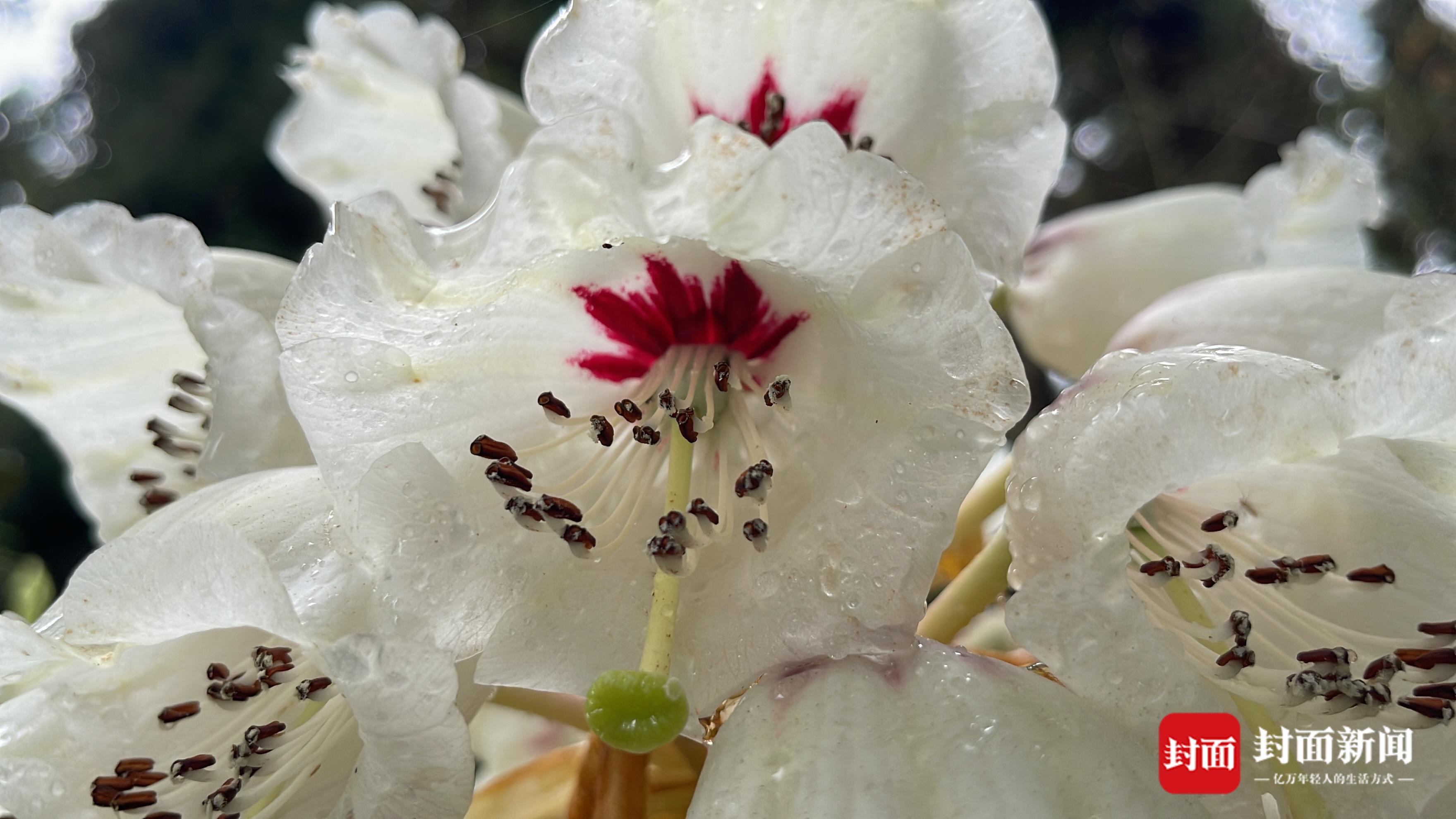 “花序直径至少是20厘米,单花直径在5厘米以上,花大。”王飞介绍,在保育园内,这次共有2株凸尖杜鹃开花,共有4朵,其中一朵花序共有单花28只。在《中国植物志》的记载中,凸尖杜鹃花序常是每朵15至20只单花。