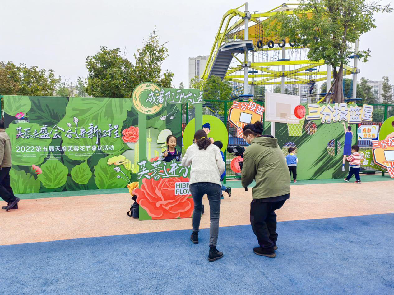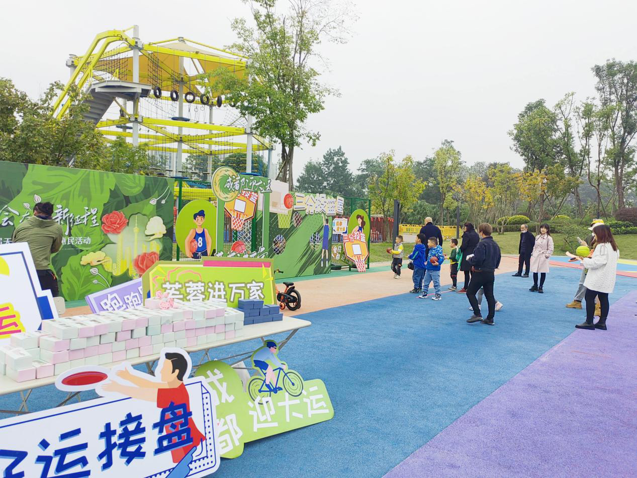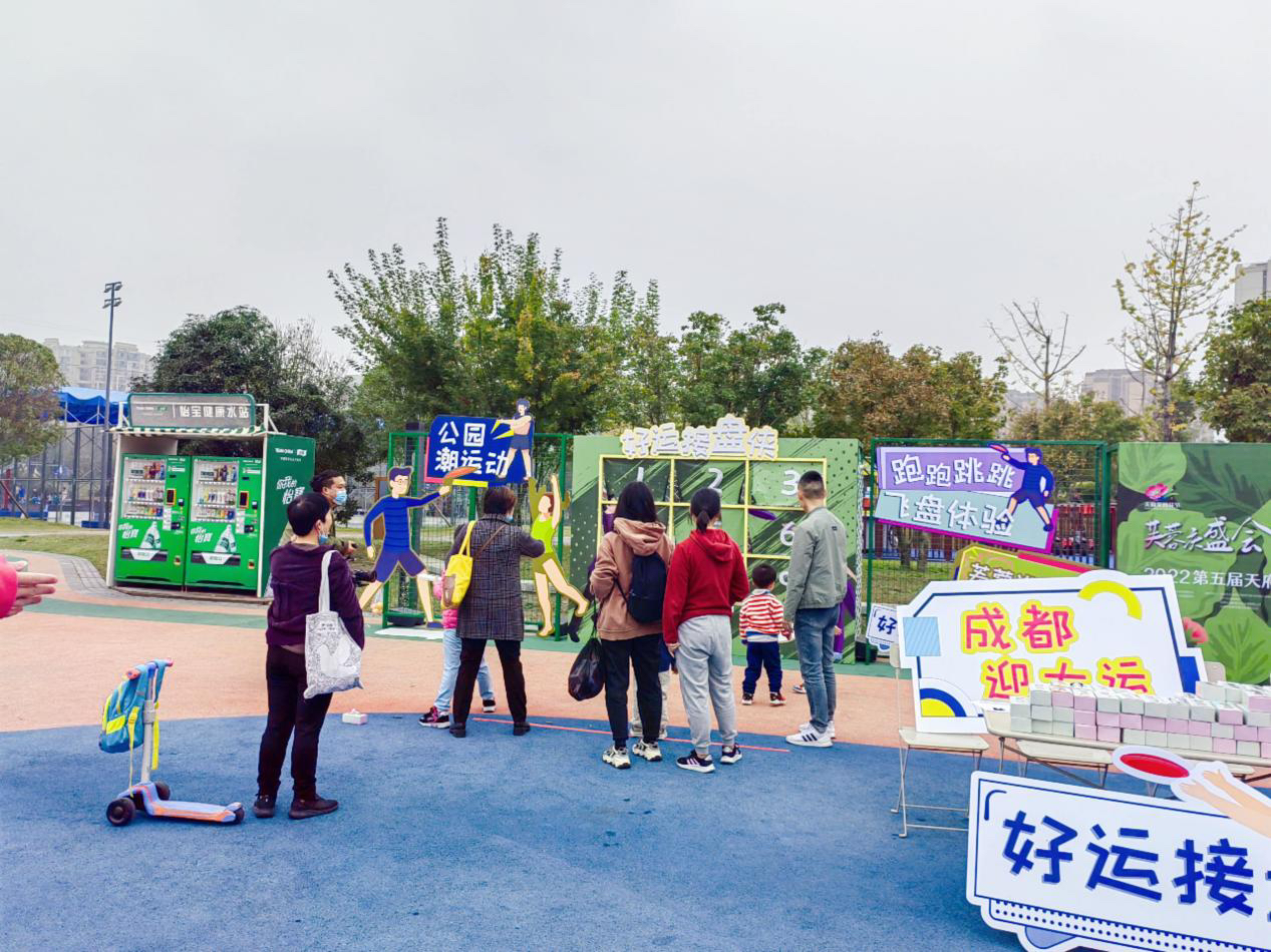 为突出“运动主题”,金泉运动公园里设置了五人制足球场、篮球场、儿童活动场、篮球场、羽毛球场等运动场所,平日里,各年龄段的市民朋友总能在这里找到属于自己的休闲方式。本次惠民活动,“好运接盘侠”“三分投篮”等运动打卡互动装置,吸引了市民积极参与互动。公园本身所具的运动风格与活动完美契合,彰显了“公园城市+体育”的高品质内涵。