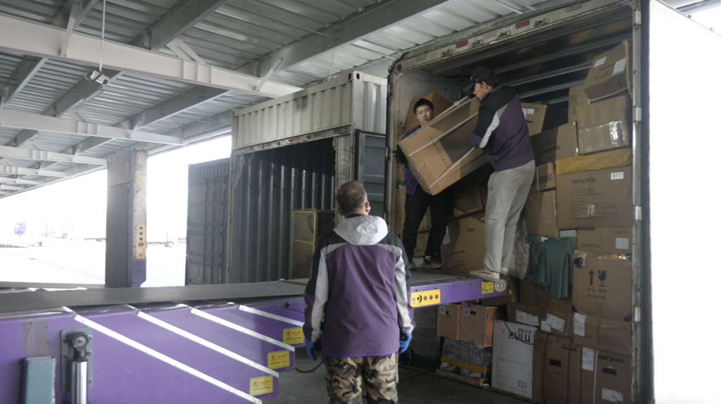 4月9日,位于新疆乌鲁木齐的中通快运现代化中心,工作人员正在分拣大件家装集运包裹。(中通快运供图)