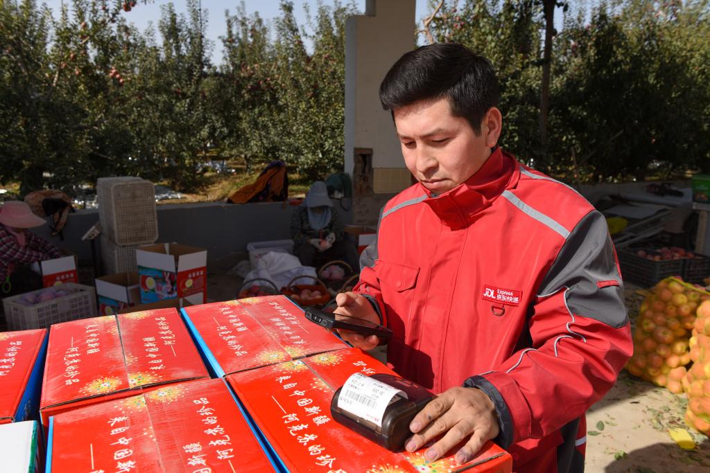 2024年10月,在新疆阿克苏地区,快递员在打印苹果线上销售的订单。新华社记者高晗 摄