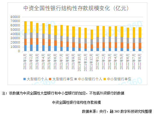 另根据人民银行公布的数据,截至2022年8月末,中资全国性银行结构性存款余额为56060.83亿元,环比下降0.52%,同比下降6.81%。具体来看,大型银行个人结构性存款规模环比下降1.73%,单位结构性存款规模环比增长0.84%;中小型银行个人结构性存款规模环比下降3.92%,单位结构性存款规模环比增长0.8%。