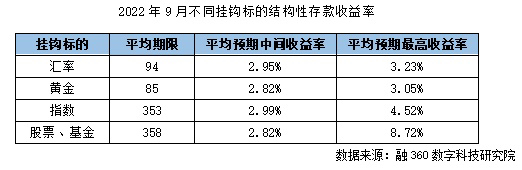 9月结构性存款收益率平均预期中间收益率小幅从不同挂钩标的结构性存款的收益率来看,9月份挂钩汇率的结构性存款平均预期中间收益率为2.95%,平均预期最高收益率为3.23%;挂钩黄金的结构性存款平均预期中间收益率为2.82%,平均预期最高收益率为3.05%;挂钩指数的结构性存款平均预期中间收益率为2.99%,平均预期最高收益率为4.52%;挂钩股票、基金的结构性存款平均预期中间收益率为2.82%,平均预期最高收益率为8.72%。