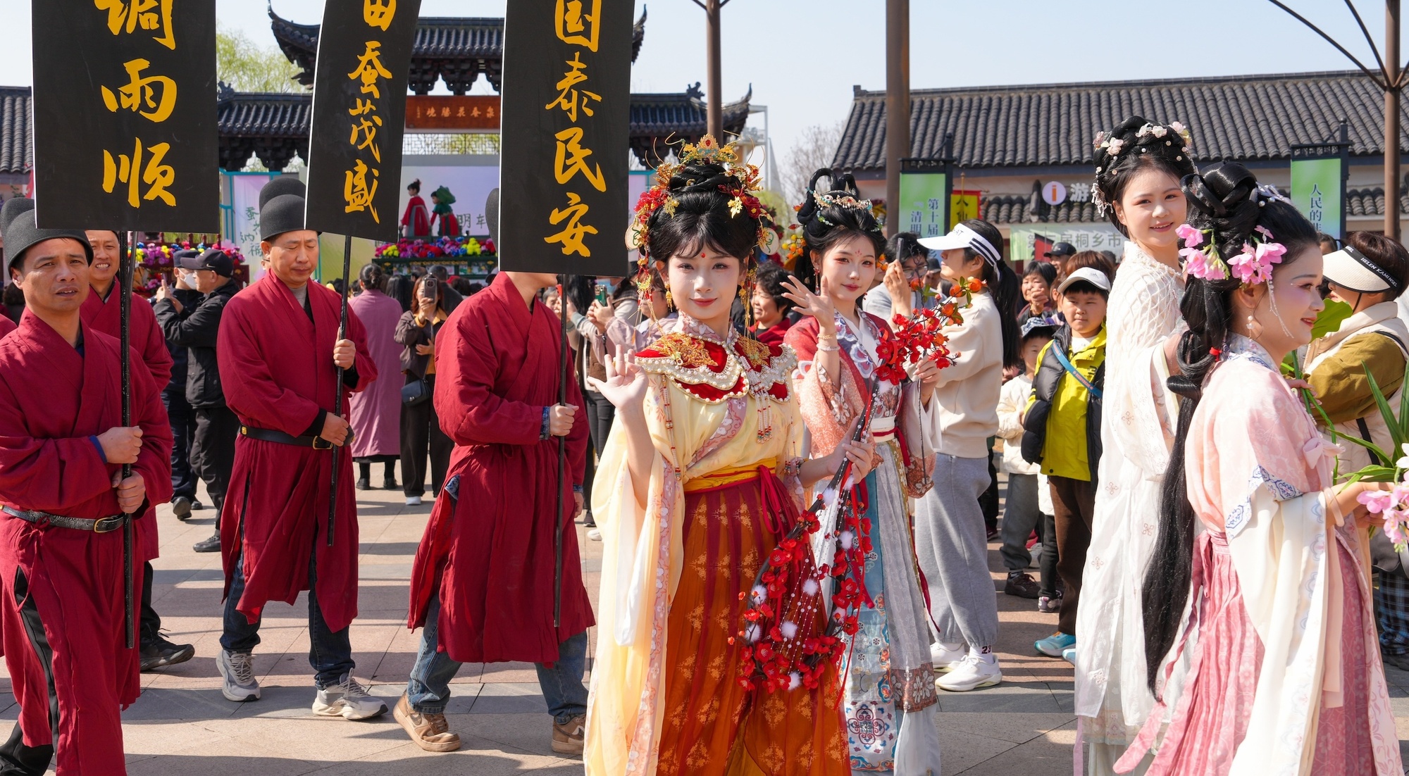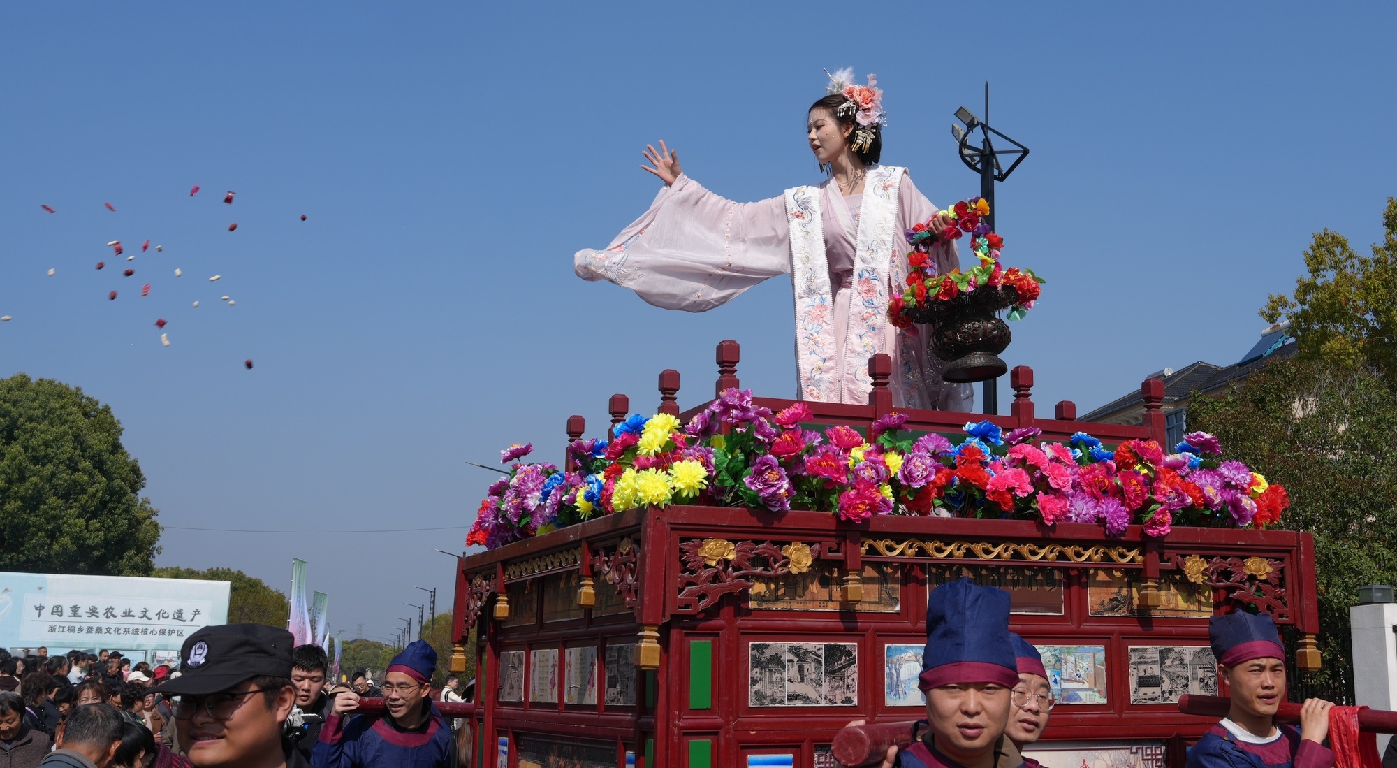 当天上午,蚕花“礼”民俗仪式上,每一个环节都承载着蚕乡儿女对风调雨顺、蚕花茂盛的美好祈愿。最令人期待的当属民俗巡游展演。来自桐乡全市各镇(街道)的民间民俗队伍浩浩荡荡穿行于村道之间;蚕花仙子与十二花神乘花船翩然而至,沿途撒下寄托祝福的蚕花,与游客互动答题。