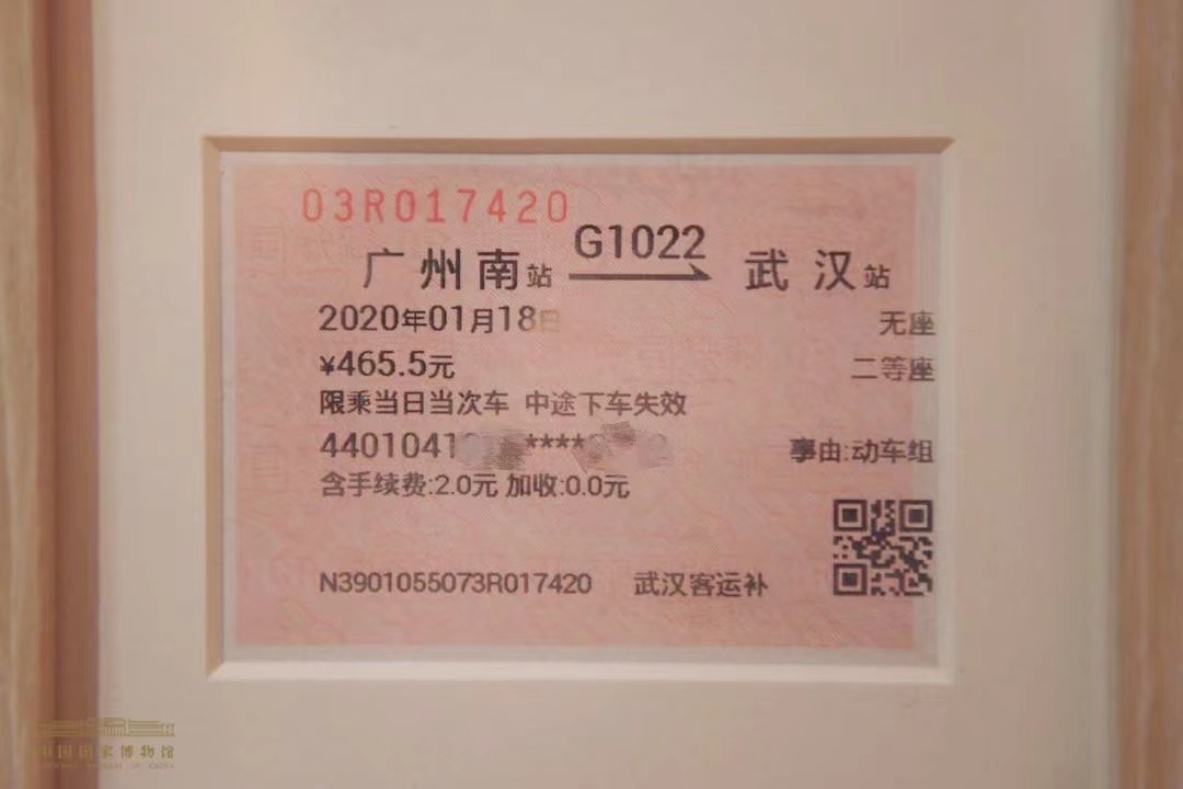 这是一张广州南到武汉的红色高铁票,时间是2020年1月18日,票价是465.5元。从车票上公开的部分身份证信息,可以看到车票的主人出生于1936年。是的,那正是时年84岁、逆行武汉抗疫的钟南山院士的车票。