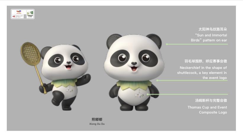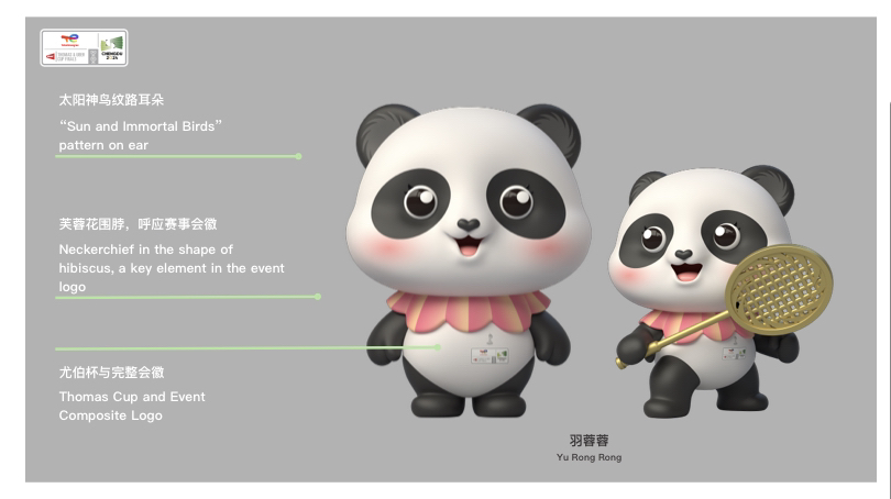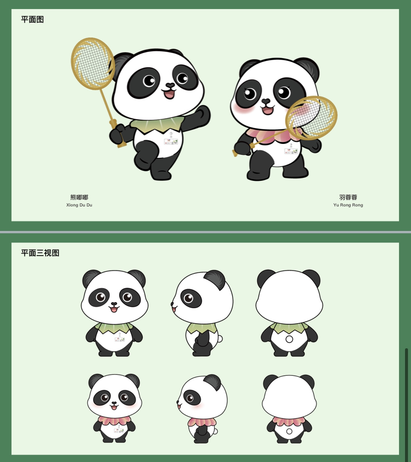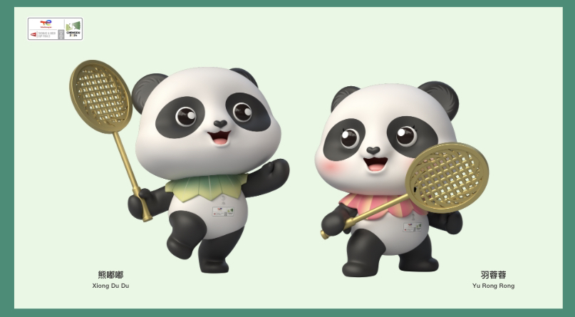 憨态可掬的“熊嘟嘟”,命名取自大熊猫以及谐音成都的“都”,代表着世界男子羽毛球团体锦标赛——汤姆斯杯;可爱活泼的“羽蓉蓉”命名取自羽毛球和蓉城的谐音,代表着世界女子羽毛球团体锦标赛——尤伯杯。