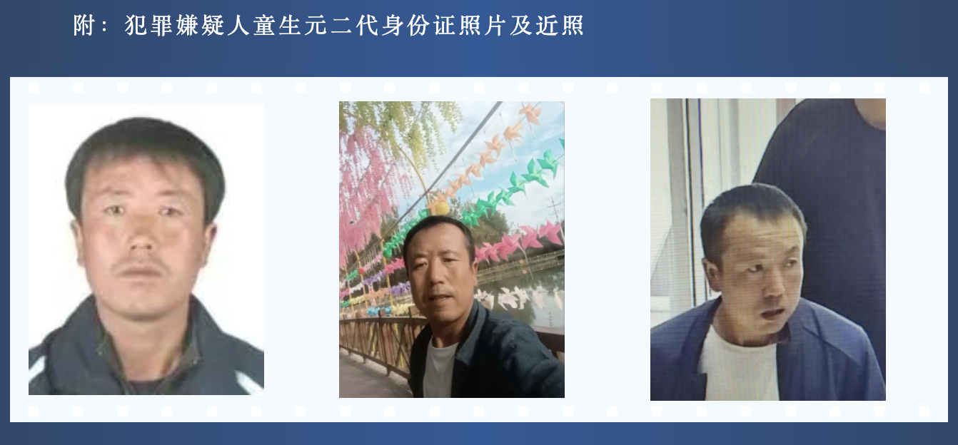 固原市公安局原州区分局前述协查通告提及,童生元是一名身高173厘米、43岁的男性,出生于1980年8月12日,户籍地宁夏固原市原州区彭堡镇杨忠堡村八组054-1号。他带有固原本地口音,逃跑时上身着灰色西装。