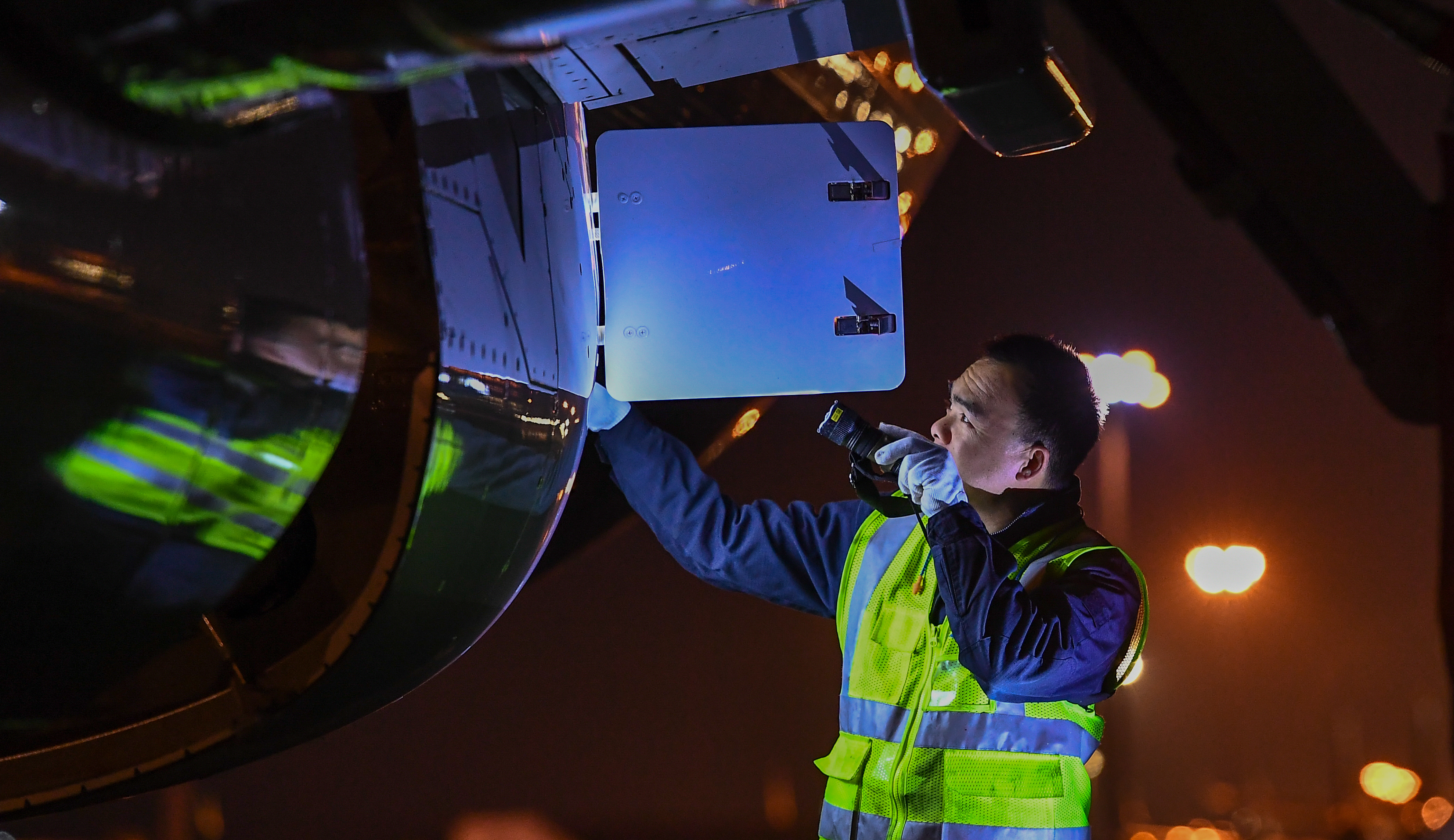 1月11日,在海口美兰国际机场停机坪上,南航工程技术分公司机务工程师对飞机进行深度检查。新华社记者 杨冠宇 摄