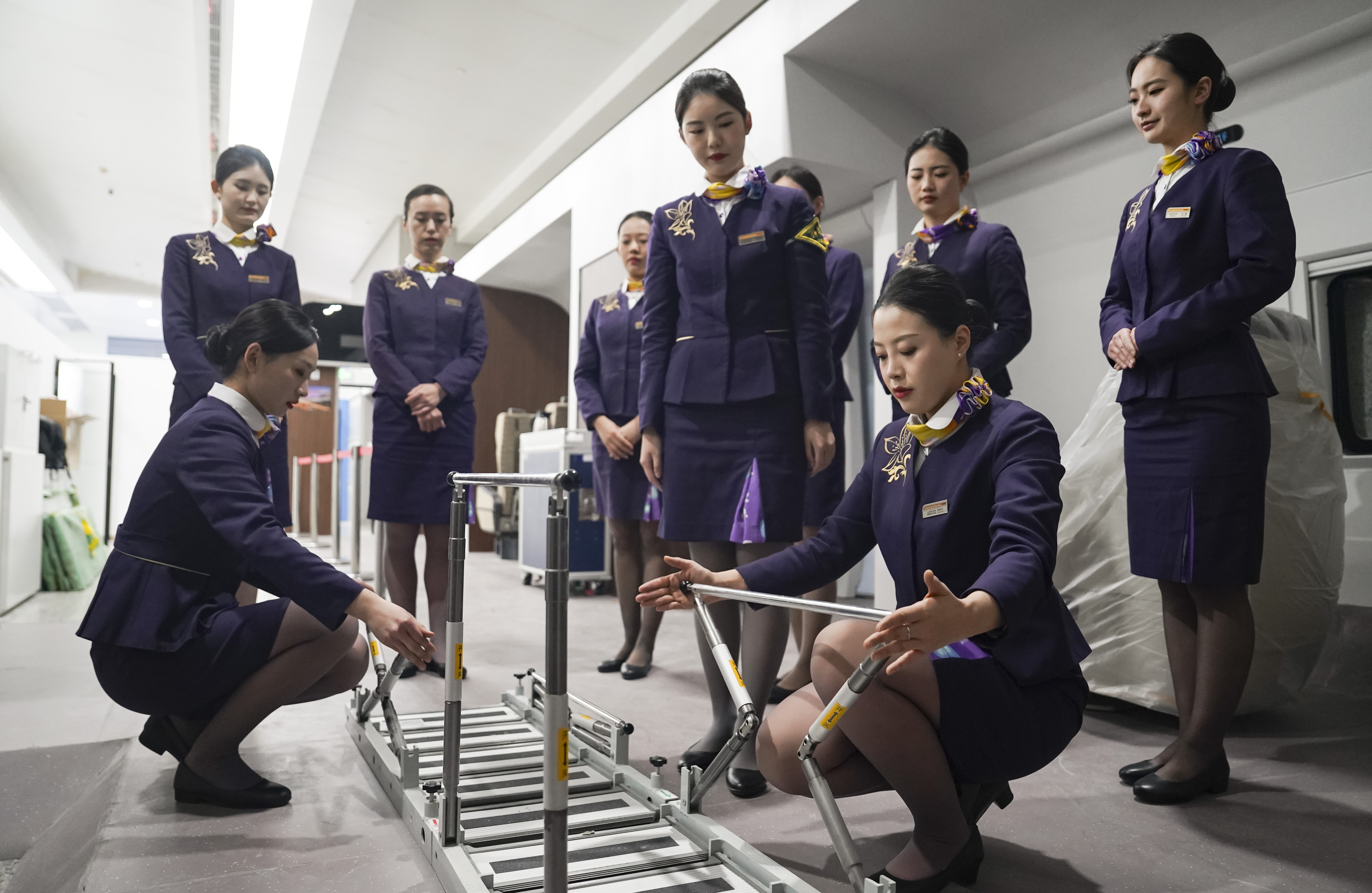 1月10日,铁路上海客运段高铁一车队乘务人员在列车模拟舱内开展应急演练培训。新华社发(程志兵摄)