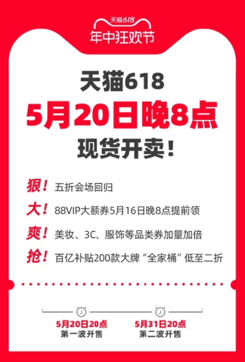 具体来看,首先,官方预售取消。今年天猫618将从5月20日晚上8点起现货开卖,消费者可分两波购买:第一波为5月20日晚8点到5月28日,第二波从5月31日晚8点到6月20日。