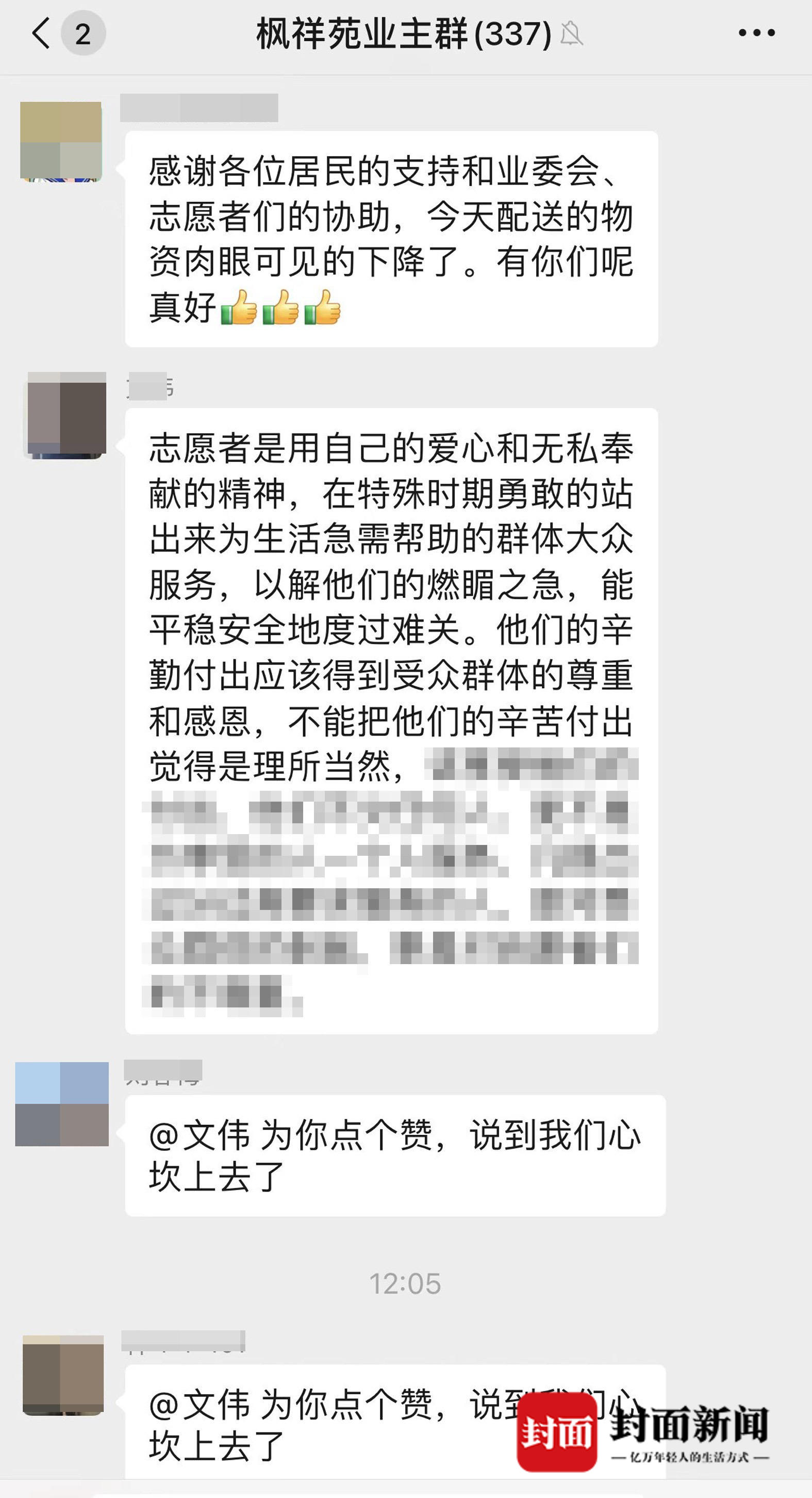“禁宵”倡议发出的当天,杉板桥社区党委副书记崔梅娟等在小区外值守的工作人员就发现需要配送的订单明显减少了,就在群里马上向居民表达了感谢。“感谢各位居民的支持和业委会、志愿者们的协助,今天配送的物资‘肉眼可见’地下降了,有你们真好!”