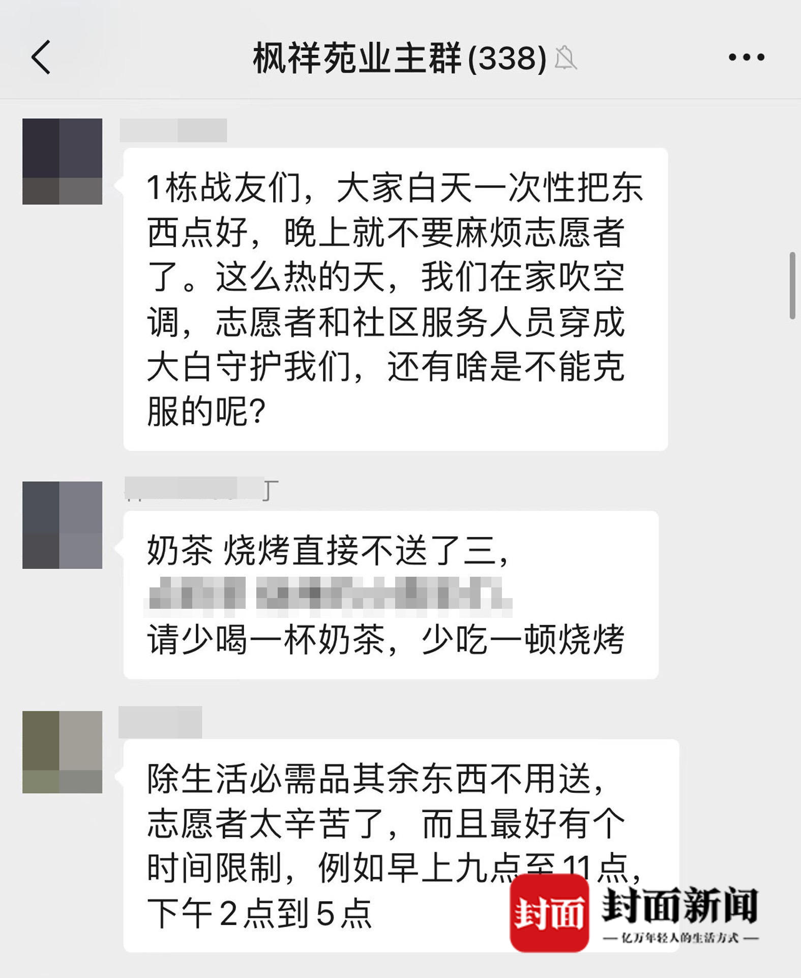 “志愿者相当于大家的亲人,请善待他们。”“支持不送烧烤、奶茶等夜宵,工作人员那么辛苦,请大家换位思考一下。”“这么热的天,我们在家吹空调,志愿者和社区服务人员守护我们,我们还有啥困难不能克服的呢?”一时间微信群里支持声不断,大家纷纷倡议“禁宵”。
