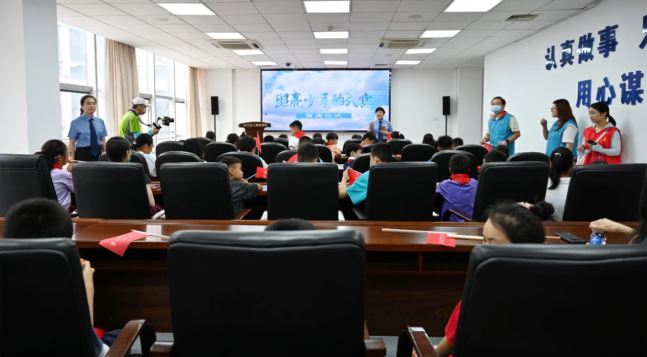 “亮晶晶·海棠花开”未检团队向参观人员介绍了心理辅导室、未成年人询问室等工作场所,组织未成年人举行模拟听证活动,未检负责人陈英对模拟听证活动的流程进行引导。