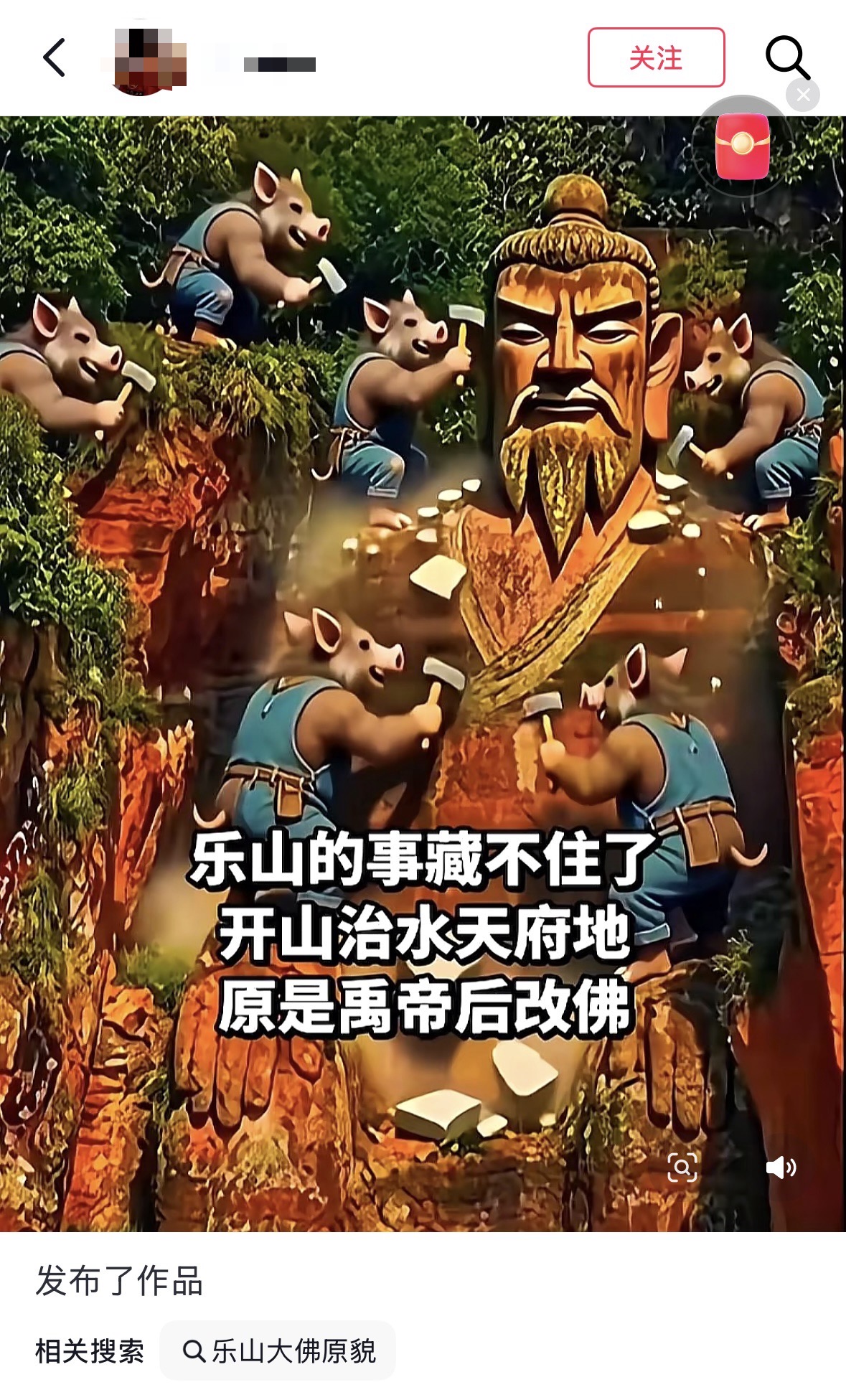 记者注意到,“乐山大佛是大禹雕像改建”的说法可追溯至数年前,近期再度被部分网民以视频、帖文形式,进行传播。不少内容还是AI生成,以及通过P图将乐山大佛头像换成大禹头像,并配文:甭管真假,看着顺眼多了。