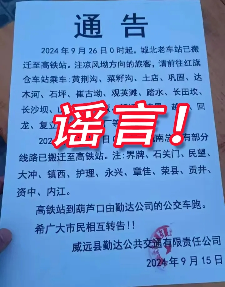 9月13日上午,一条关于四川威远城北老车站搬迁的“通告”在当地群众微信群里流传。“通告”贴合了老百姓对于交通出行的关注,内容详细,有落款单位和鲜章,煞有其事。经相关部门证实,这条“通告”属于谣言,造谣者已到案接受调查。