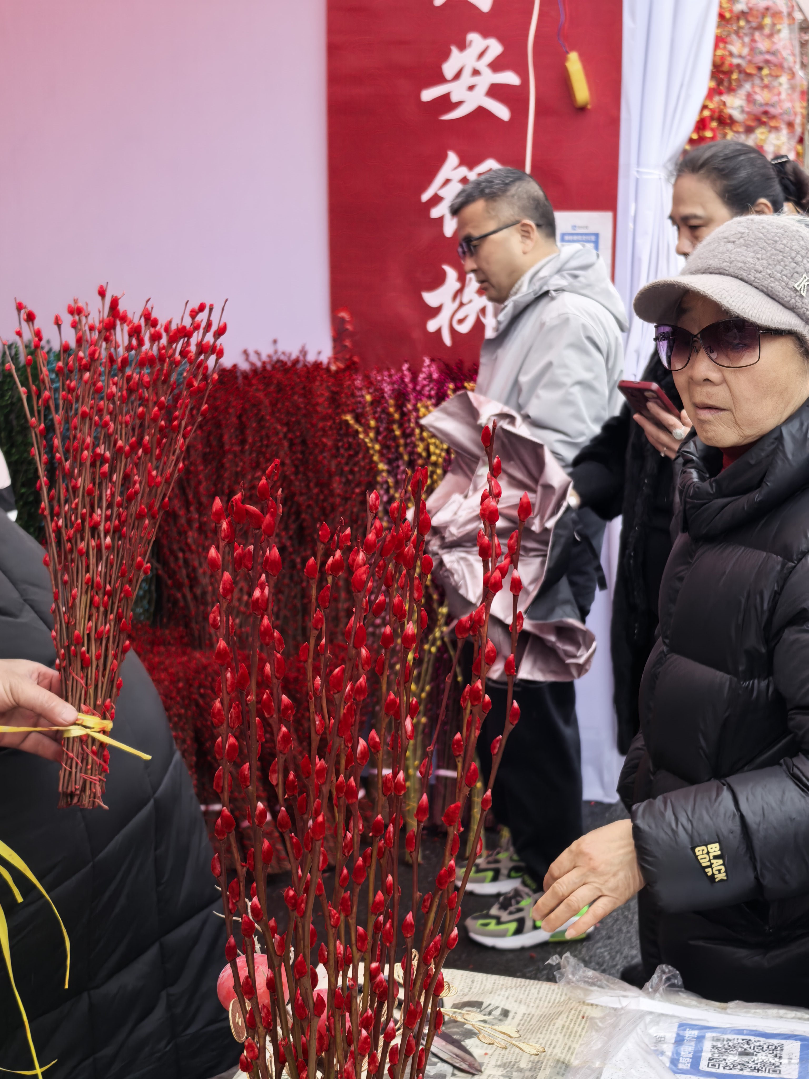 从春节临近到节日期间,成都的花市一天比一天热闹。2月19日,大年初三,在温江区的花店里,早就挤满了来挑年宵花的市民。蝴蝶兰开得正艳,冬青的红果子挂满枝头,银柳扎成一束束摆在门口,空气中弥漫着腊梅的清香。
