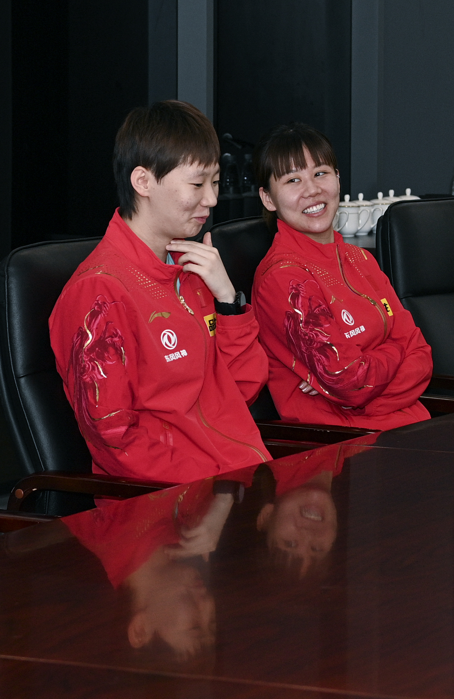 4月3日,女队球员王曼昱(左)与陈幸同在新闻发布会上。新华社记者 陶希夷 摄