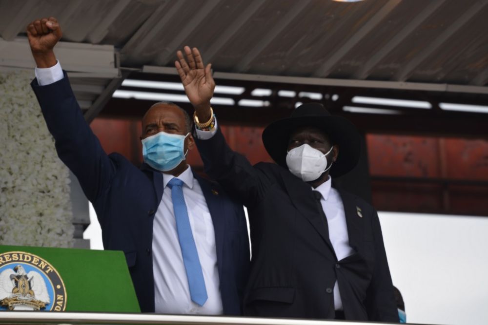 2020年10月3日,在南苏丹首都朱巴,苏丹主权委员会主席布尔汉(左)同南苏丹总统基尔在最终和平协议签署仪式现场向人群致意。新华社发(戴尼斯摄)