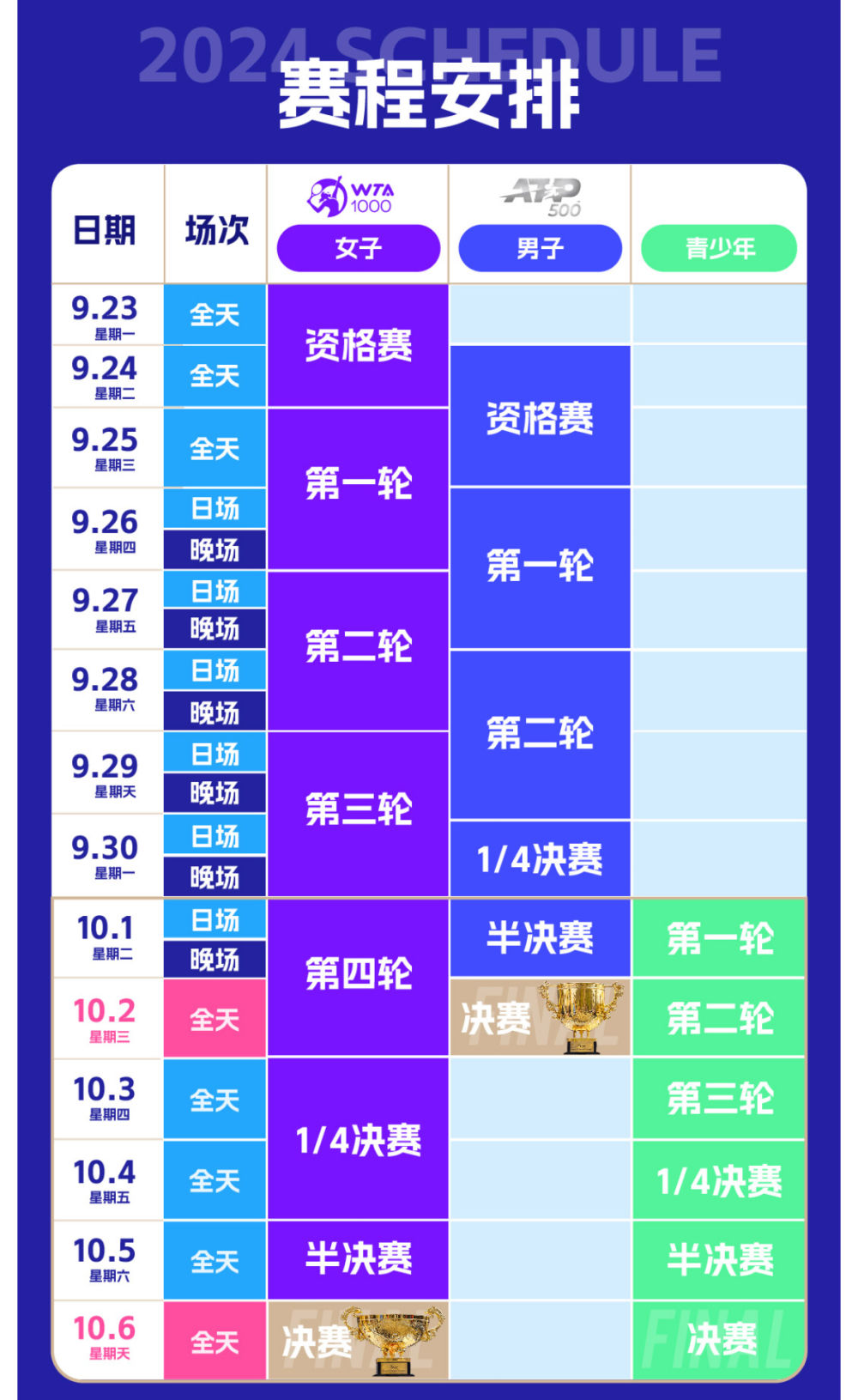 男单决赛将于10月2日上演