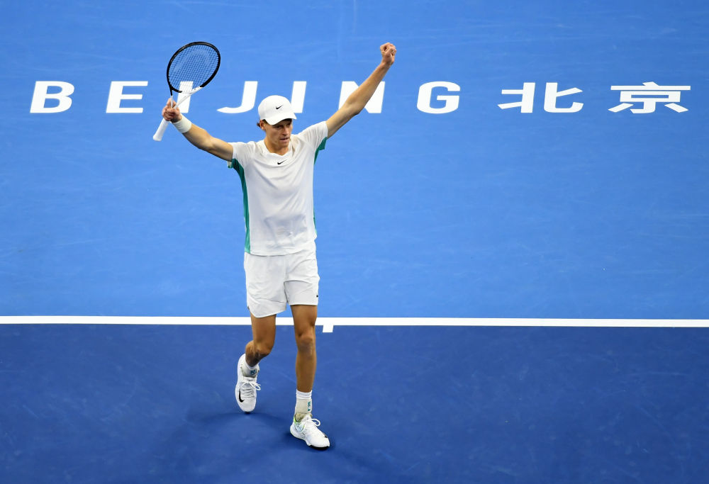 2023年10月4日,辛纳在夺得2023中国网球公开赛男子单打冠军后庆祝。新华社记者 张晨霖 摄