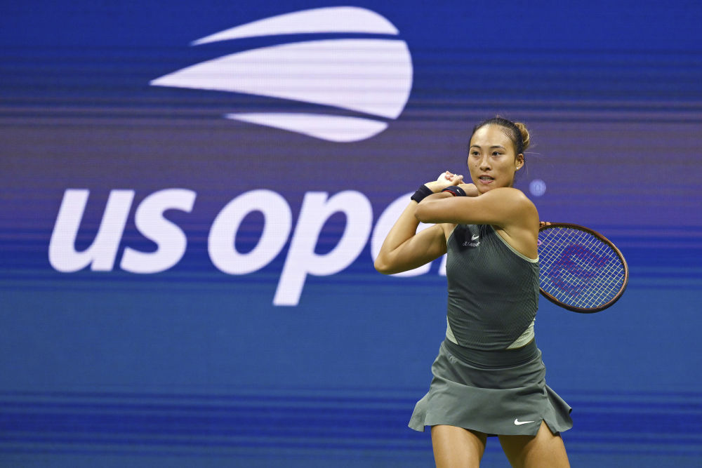 中国选手郑钦文在2024美国网球公开赛女子单打四分之一决赛中。新华社记者 李睿 摄