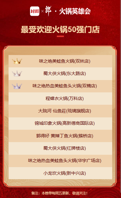 本周四大英雄榜单动态更新,快来看看你和你喜爱的火锅店是否榜上有名!