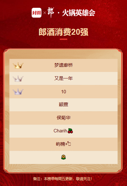 该榜单针对参与活动的火锅门店,根据销售郎酒产品金额进行排名,互动结束后最终排名前50位的火锅门店可获郎酒大礼。