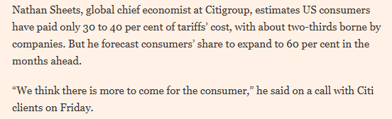 文章援引花旗集团全球首席经济学家内森·希茨的观点报道称,目前美国消费者仅承担了关税成本的30%至40%,约三分之二的关税成本由企业消化。但他预测,未来数月消费者的承担比例将扩大至60%,“消费者还将面临更多影响”。