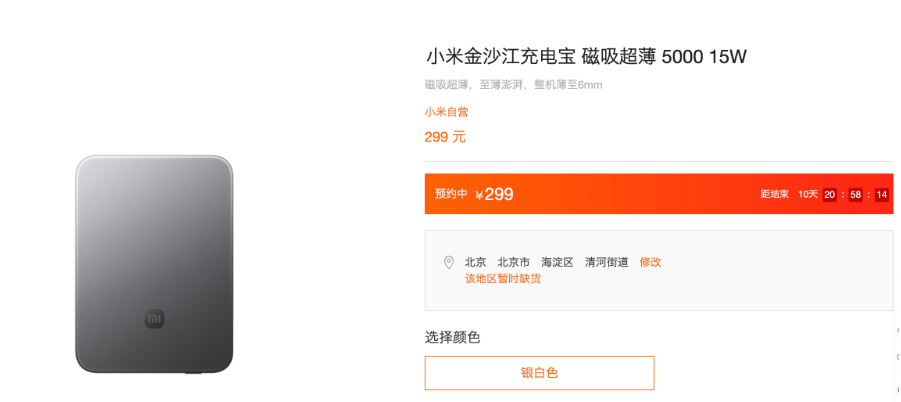 发布会上,小米还推出了一款磁吸充电宝新品——小米金沙江充电宝,售价299元。仅上架一晚,这款充电宝便已卖断货,小米商城显示“暂时缺货”。