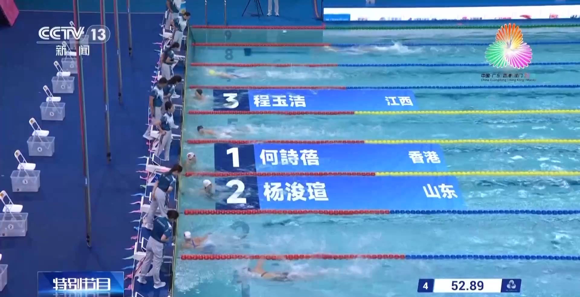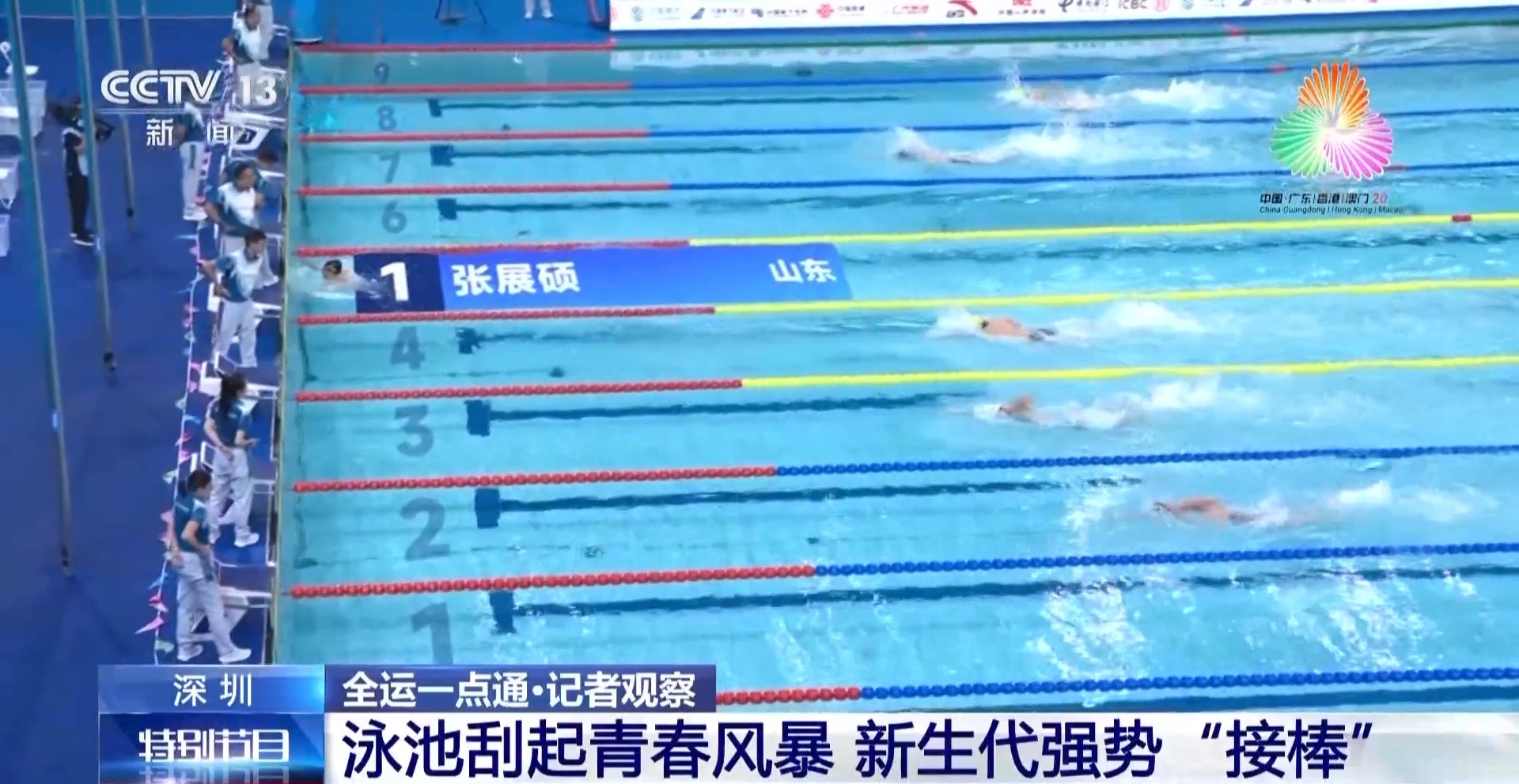 本届全运会首次由粤港澳三地联合举办,来自香港的运动员何诗蓓在女子200米自由泳比赛中获得了个人全运会首金,为香港队实现游泳项目金牌零的突破。同时本届全运会游泳比赛,多项成绩达到了亚洲一流水准。这也是中国游泳备战2028洛杉矶奥运周期的一次重要练兵。我们也期待着这些泳池健将们向着更高目标,继续冲刺。